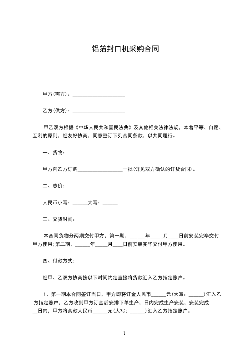 1、第一期本合同签订当日,甲方即将订金人民币______元(大写:______)汇入乙方指定账户,乙方收到甲方订金后安排下单生产,日内完成生产安装,安装完成______日内,甲方将余款人民币______元(大写:______)汇入乙方指定账户。