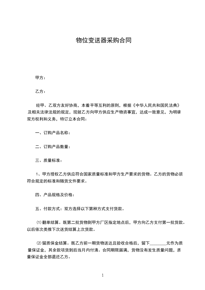 (2)留质保金结算。既乙方前一期货物送达且验收合格后,留下________元作为质量保证金,其余款项货到后当月内付清。合同期限届满,货物没有发生质量问题,质量保证金全部退还乙方。