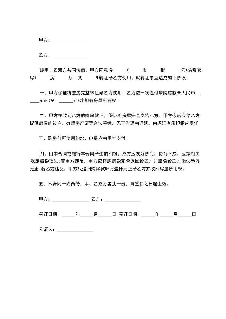 本协议履行中,甲方除收取因转让本次购房资格的报酬_________万元整(_________)元外。不再向乙方收取除集资款外的任何费用,因办理房屋产权而发生的各种法定税、费由乙方承担。