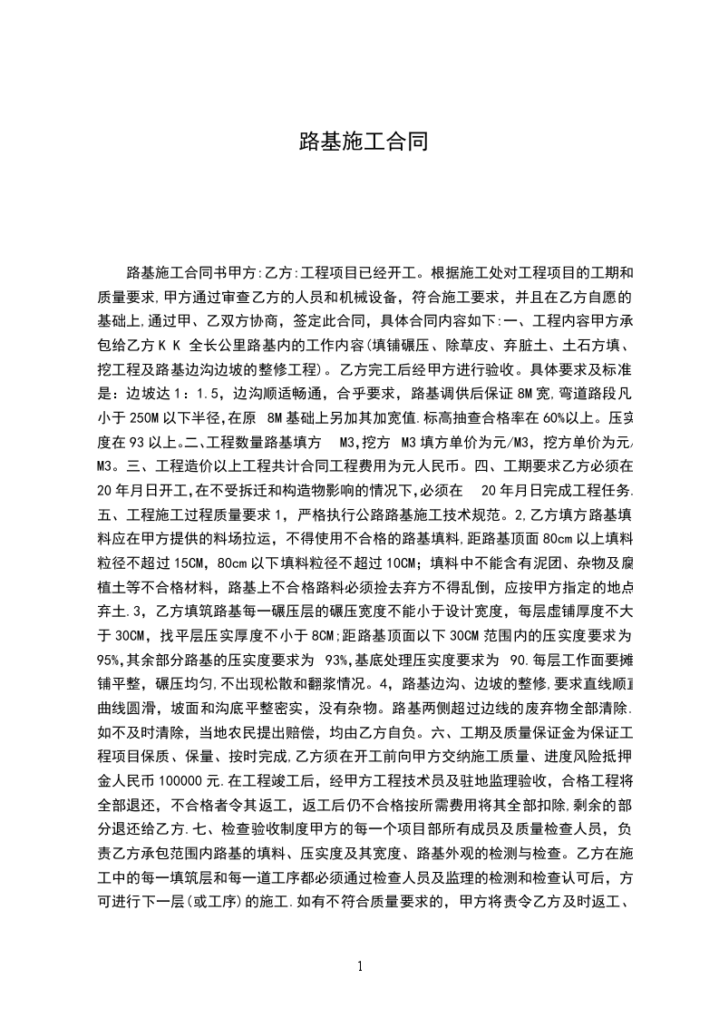1、负责施工场地的平整、施工界内的用水、用电(水源、电源甲乙双方应根据具体情况明确责任)及施工便道(包括去弃土场的施工便道)和乙方临时设施的修建。自行承担乙方人员的吃、住、行及施工机械设备的进退场费用。临建及用水用电符合安全质量要求,如因隐患出现事故由乙方自行承担责任;因车辆必须手续齐全,如因手续不全而遭到路政、交警等部门的扣留或意外事故,由乙方自行负责。