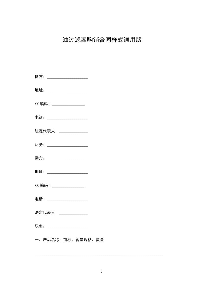油过滤器购销合同样式通用版