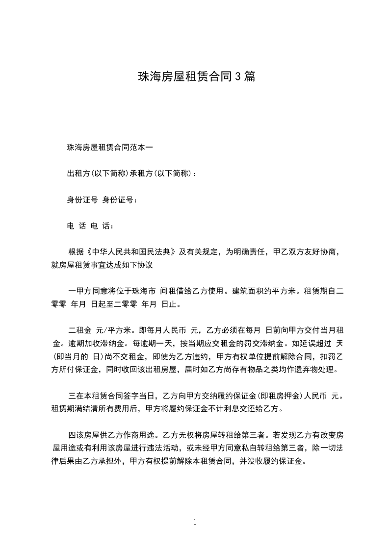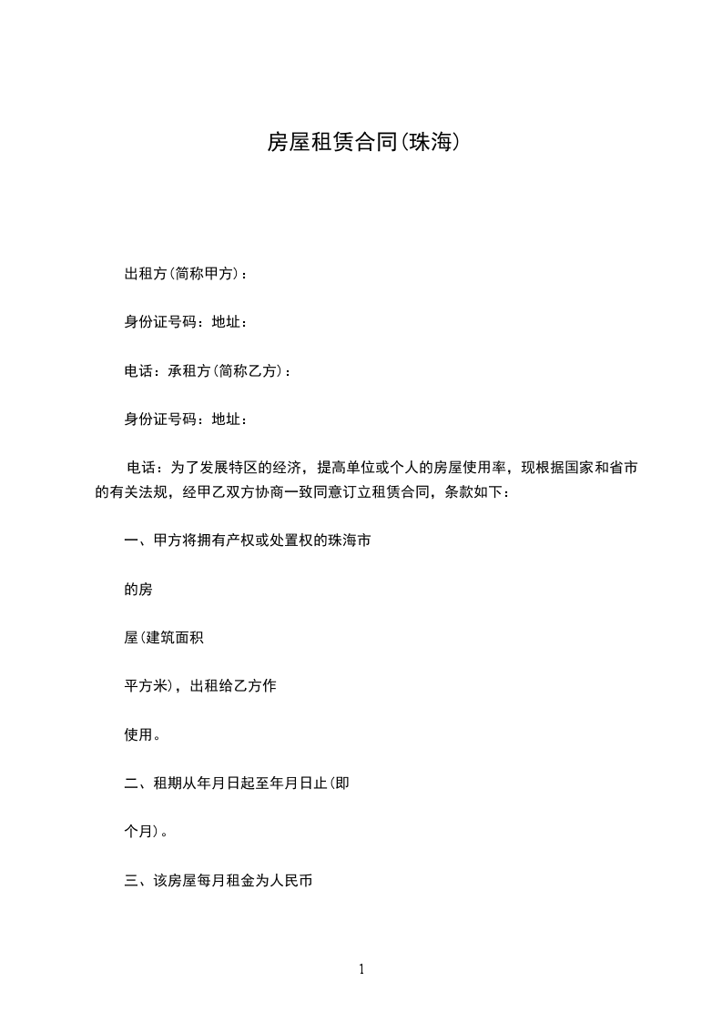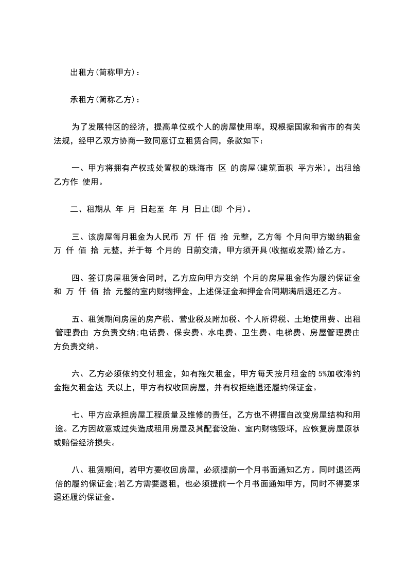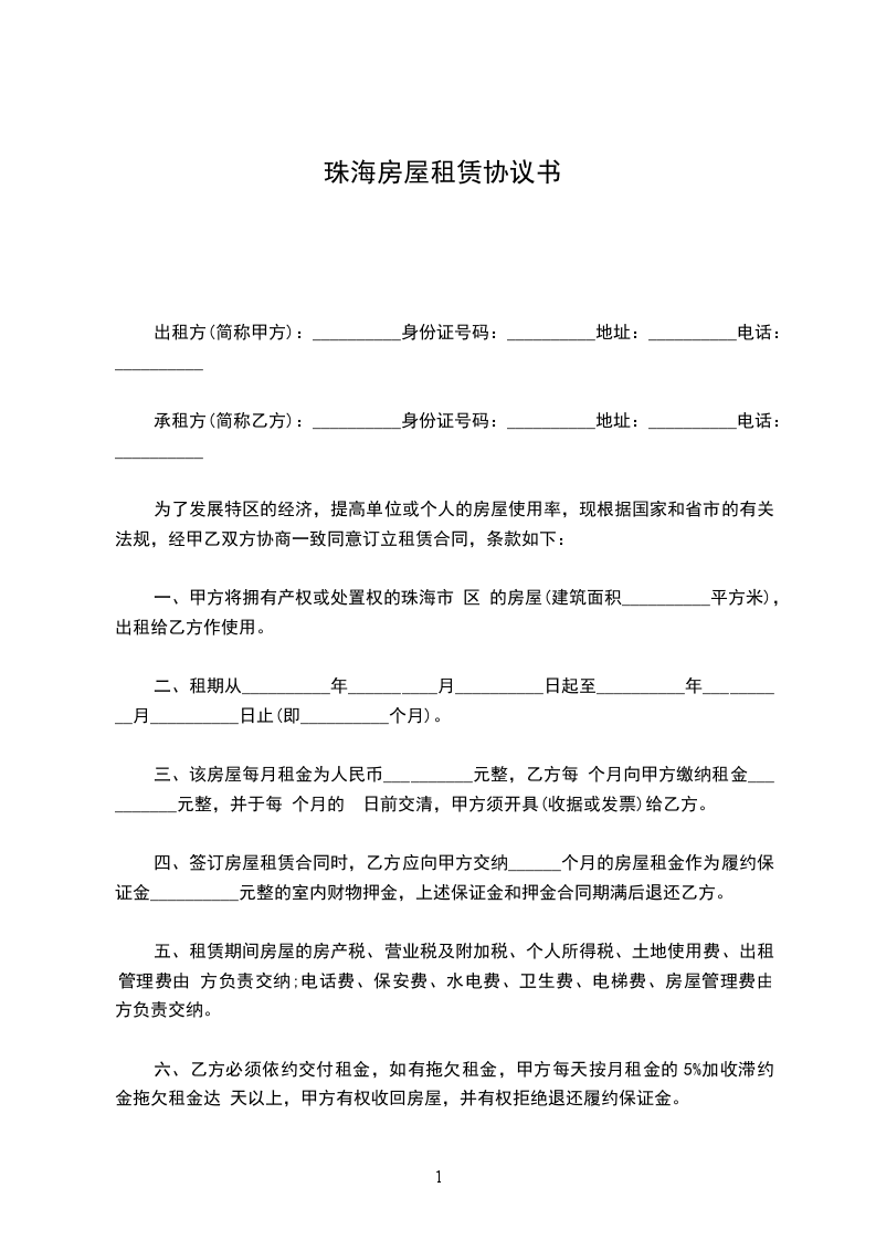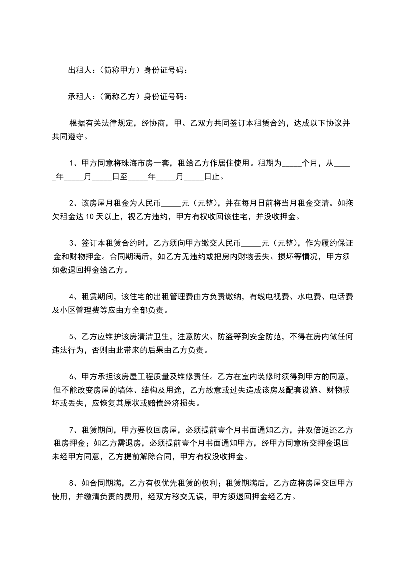 1、甲方同意将珠海市房一套,租给乙方作居住使用。租期为_____个月,从_____年_____月_____日至_____年_____月_____日止。