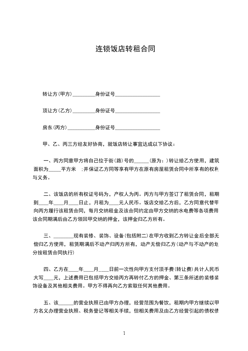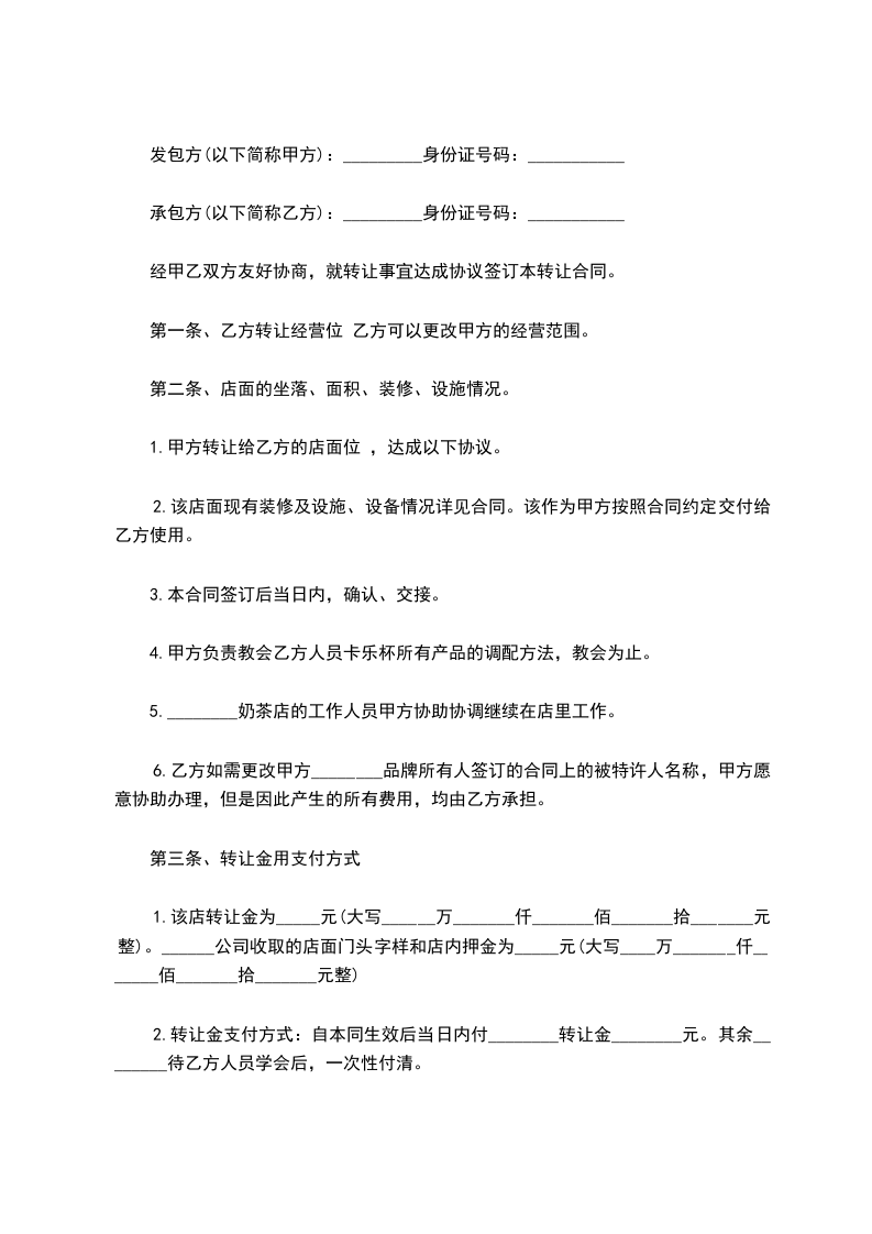 2、甲方将饭店设备折价人民币____元转让给乙方,乙方在签订合同当_____日一次性支付饭店设备款______元给甲方;