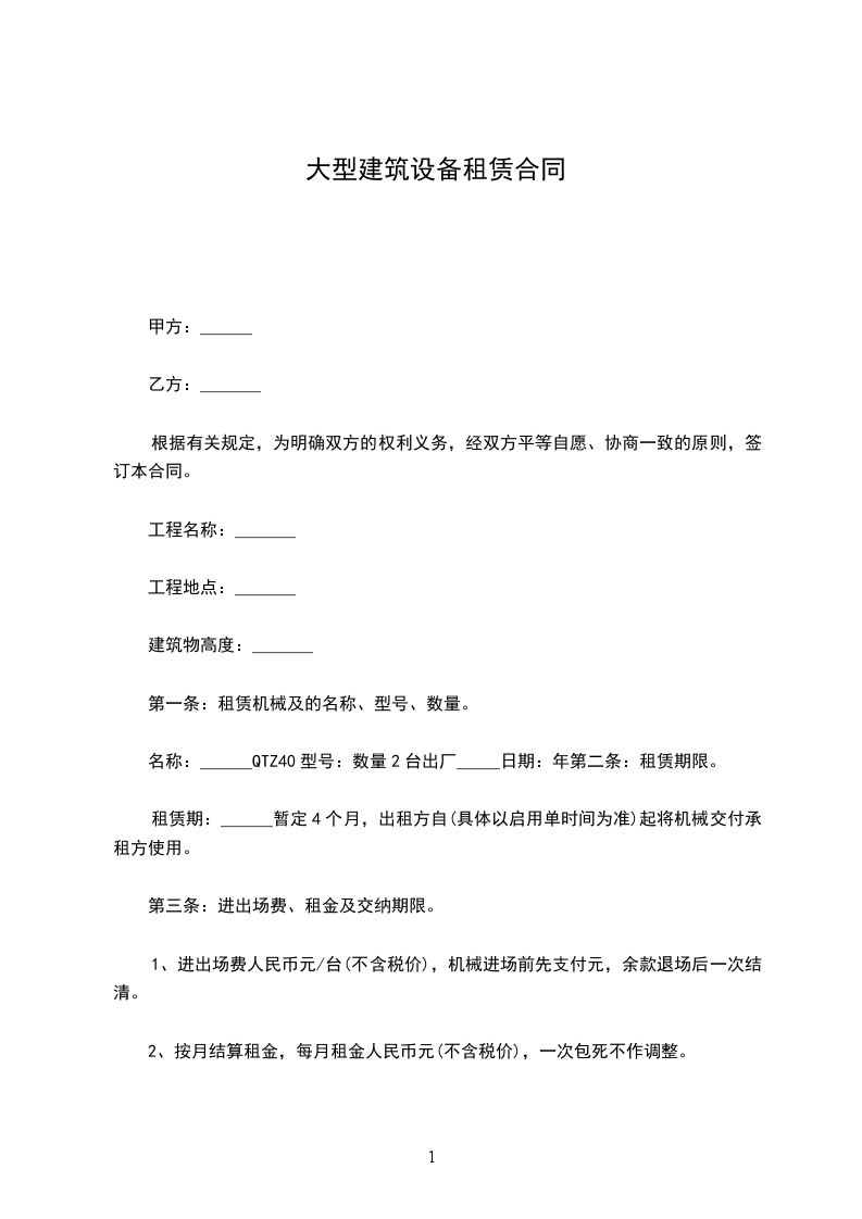 名称:______QTZ40型号:数量2台出厂_____日期:年第二条:租赁期限。