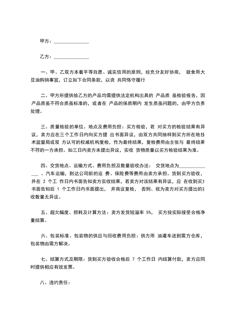 一、甲、乙双方本着平等自愿、诚实信用的原则,经充分友好协商, 就食用大豆油购销事宜,订立如下合同条款,以资 共同恪守履行
