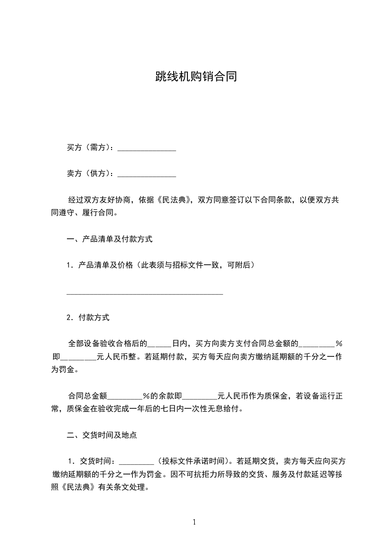 1.交货时间:_________(投标文件承诺时间)。若延期交货,卖方每天应向买方缴纳延期额的千分之一作为罚金。因不可抗拒力所导致的交货、服务及付款延迟等按照《民法典》有关条文处理。