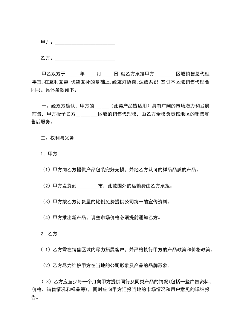 一、经双方确认:甲方的______(此类产品皆适用)具有广阔的市场潜力和发展前景,甲方授予乙方_________区域的销售代理权,由乙方全权负责该地区的销售和售后服务。