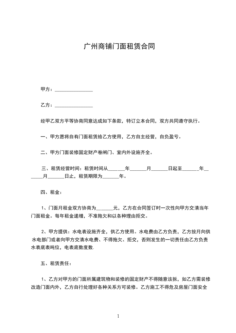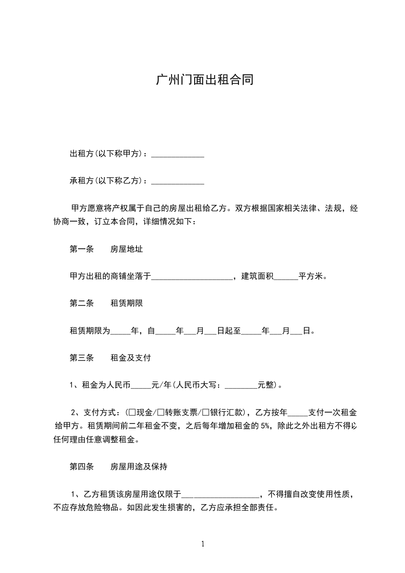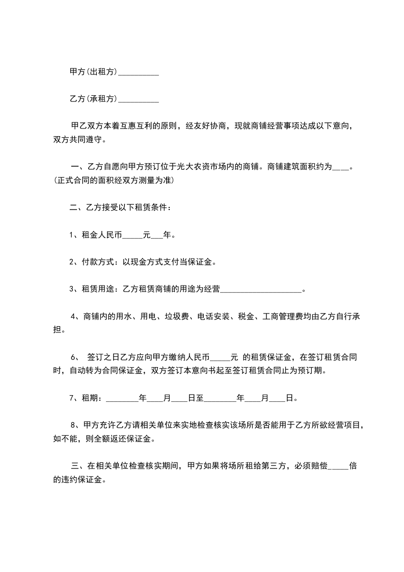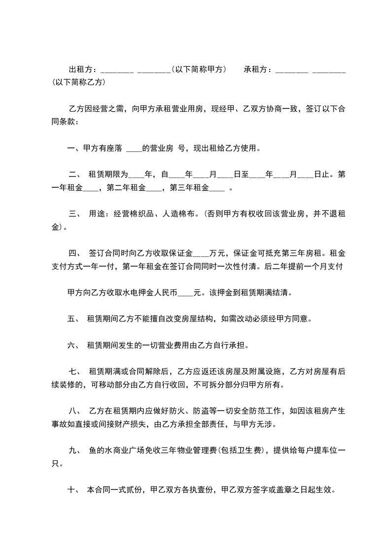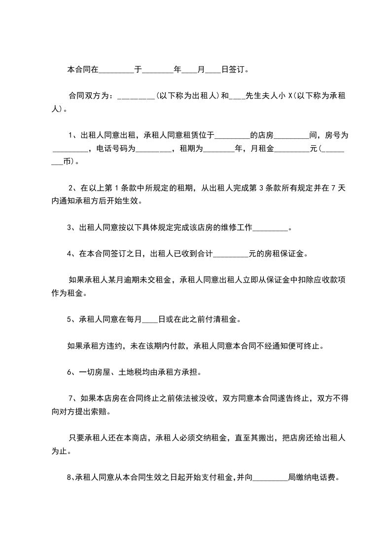 1、出租人同意出租,承租人同意租赁位于_________的店房_________间,房号为_________,电话号码为_________,租期为________年,月租金_________元(_________币)。