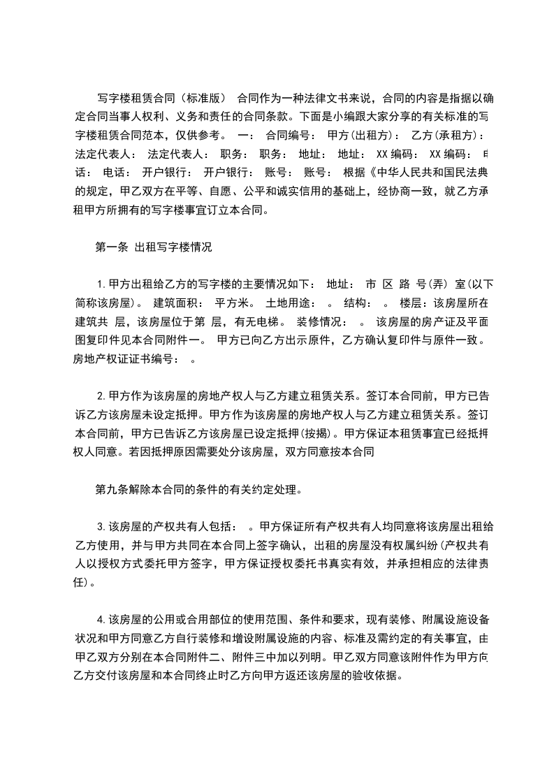 1.甲方出租给乙方的写字楼的主要情况如下: 地址: 市 区 路 号(弄) 室(以下简称该房屋)。 建筑面积: 平方米。 土地用途: 。 结构: 。 楼层:该房屋所在建筑共 层,该房屋位于第 层,有无电梯。 装修情况: 。 该房屋的房产证及平面图复印件见本合同附件一。 甲方已向乙方出示原件,乙方确认复印件与原件一致。 房地产权证证书编号: 。