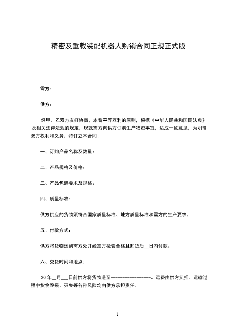 20年__月___日前供方将货物送至-----------------。运费由供方负担。运输过程中货物毁损、灭失等各种风险均由供方承担责任。