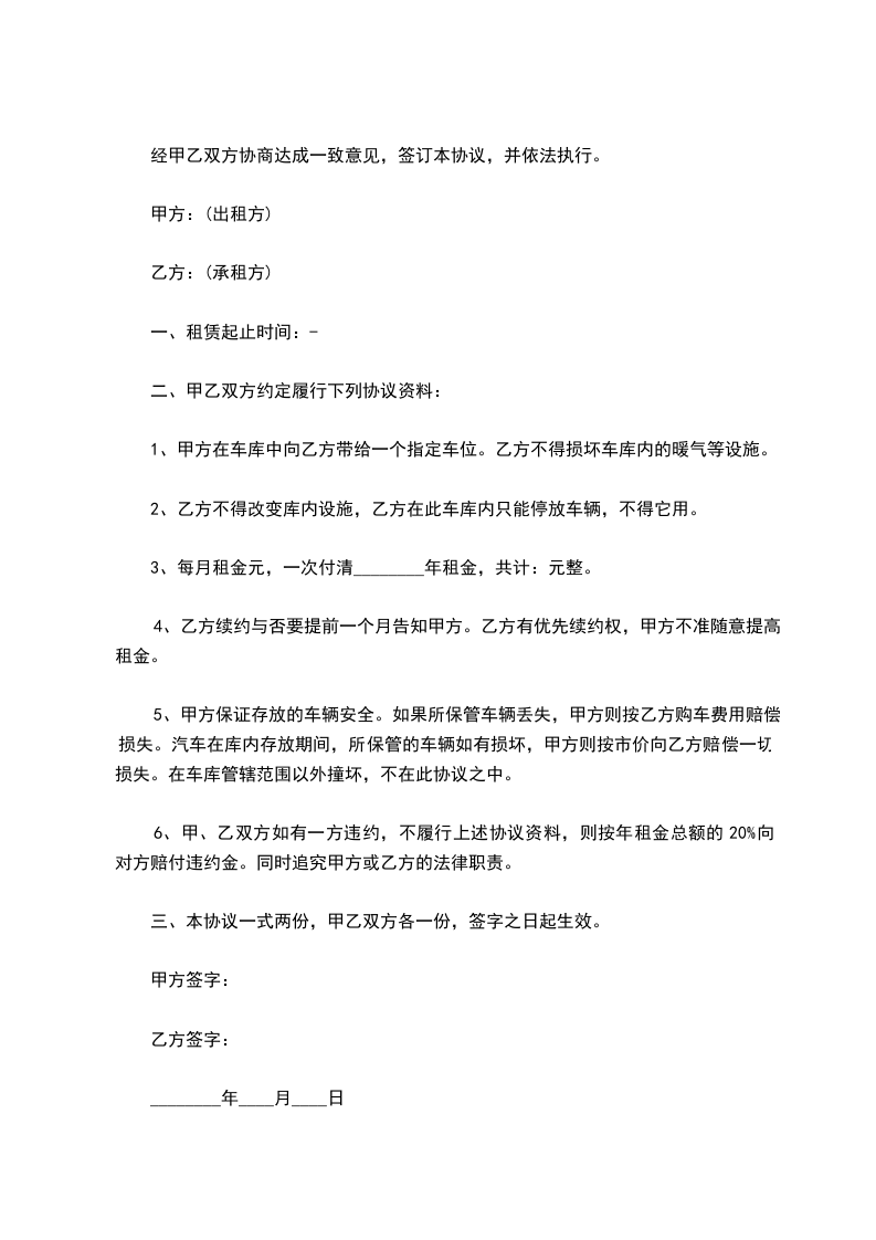 1、甲方在车库中向乙方带给一个指定车位。乙方不得损坏车库内的暖气等设施。