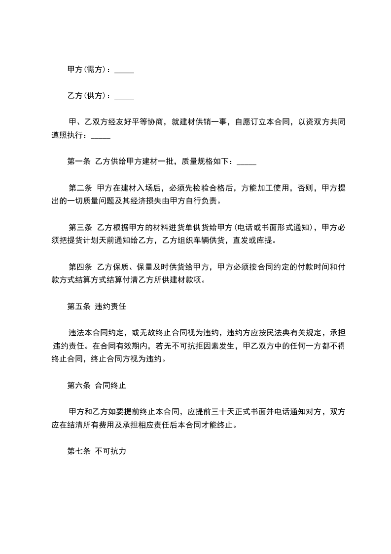 4、双方合作期间,如甲方发现乙方供给其他采购商的价格低于本协议价格时、或提采购物不能满足本工程技术和设计要求时,甲方有权单方终止合同,另行选择材料供应商,乙方承担由此引起的一切损失。