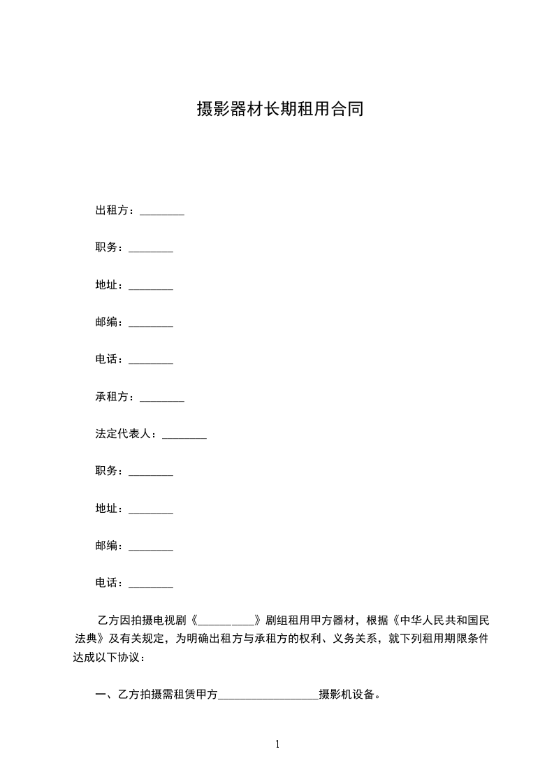 乙方因拍摄电视剧《__________》剧组租用甲方器材,根据《中华人民共和国民法典》及有关规定,为明确出租方与承租方的权利、义务关系,就下列租用期限条件达成以下协议: