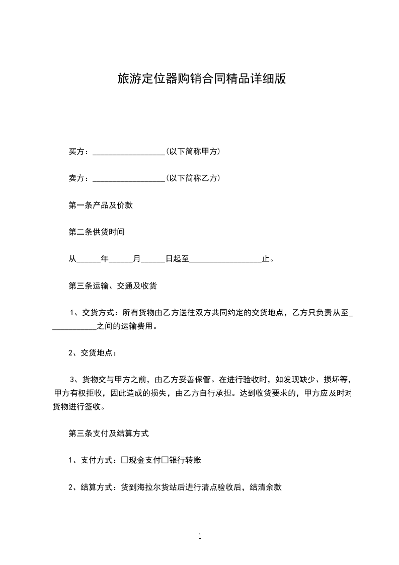 1、交货方式:所有货物由乙方送往双方共同约定的交货地点,乙方只负责从至____________之间的运输费用。