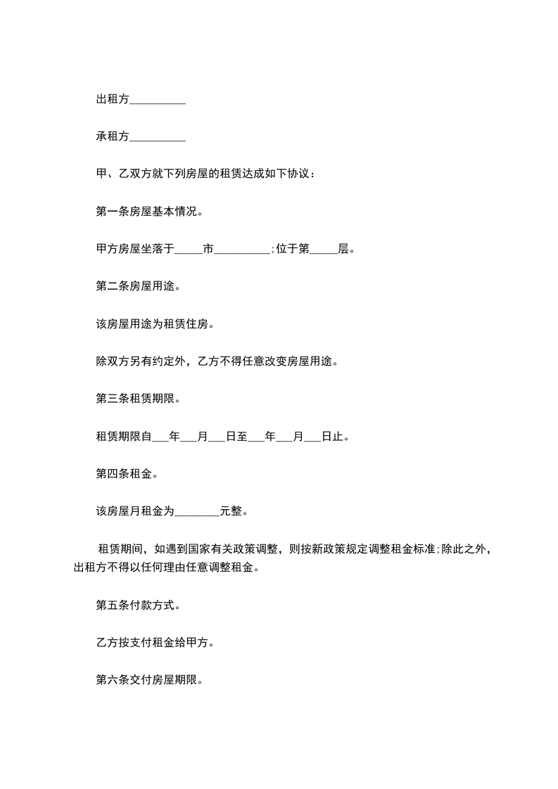 租赁期间,如遇到国家有关政策调整,则按新政策规定调整租金标准;除此之外,出租方不得以任何理由任意调整租金。