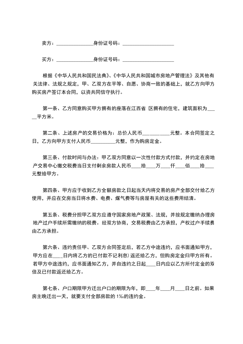 第七条、户口期限甲方迁出户口的期限为年,即____年____月____日之前。如果房主晚迁出一天,就要支付全部房款的1‰的违约金。