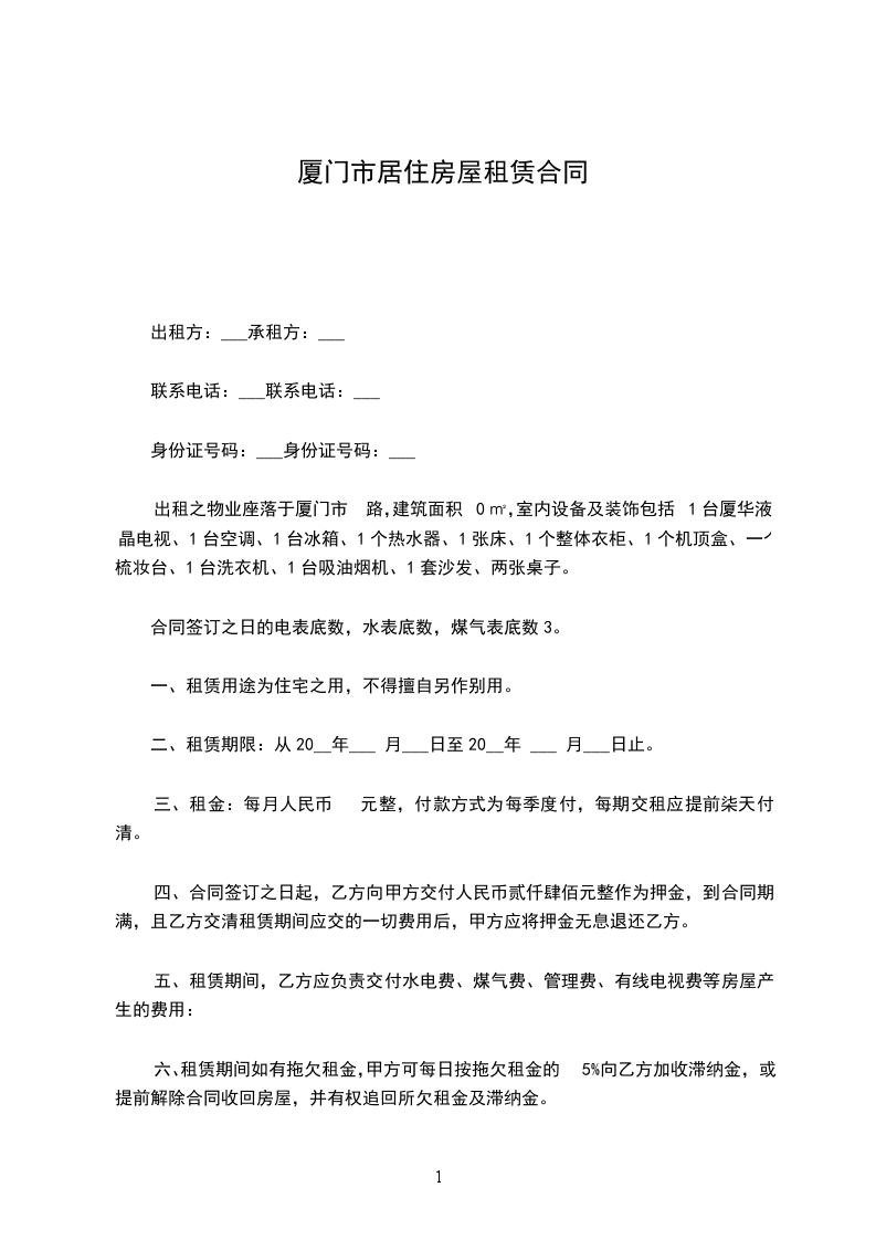 出租之物业座落于厦门市 路,建筑面积0㎡,室内设备及装饰包括1台厦华液晶电视、1台空调、1台冰箱、1个热水器、1张床、1个整体衣柜、1个机顶盒、一个梳妆台、1台洗衣机、1台吸油烟机、1套沙发、两张桌子。
