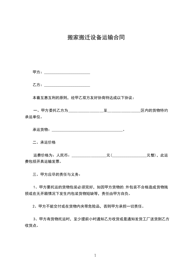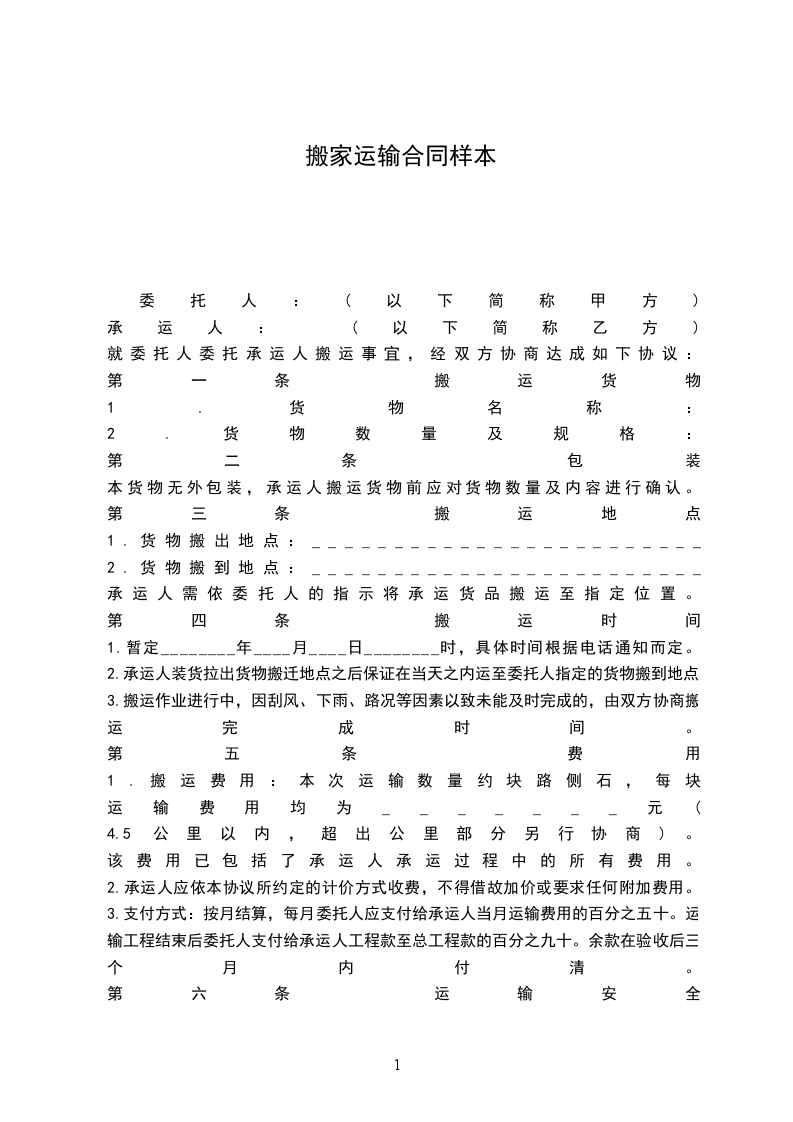 1.承运人保证在协议规定期限内,根据委托人指定的路线将货物清单中列明的货物安全运抵指定地点。如承运人未按要求摆放,造成二次运输,产生的费用由承运人负责。