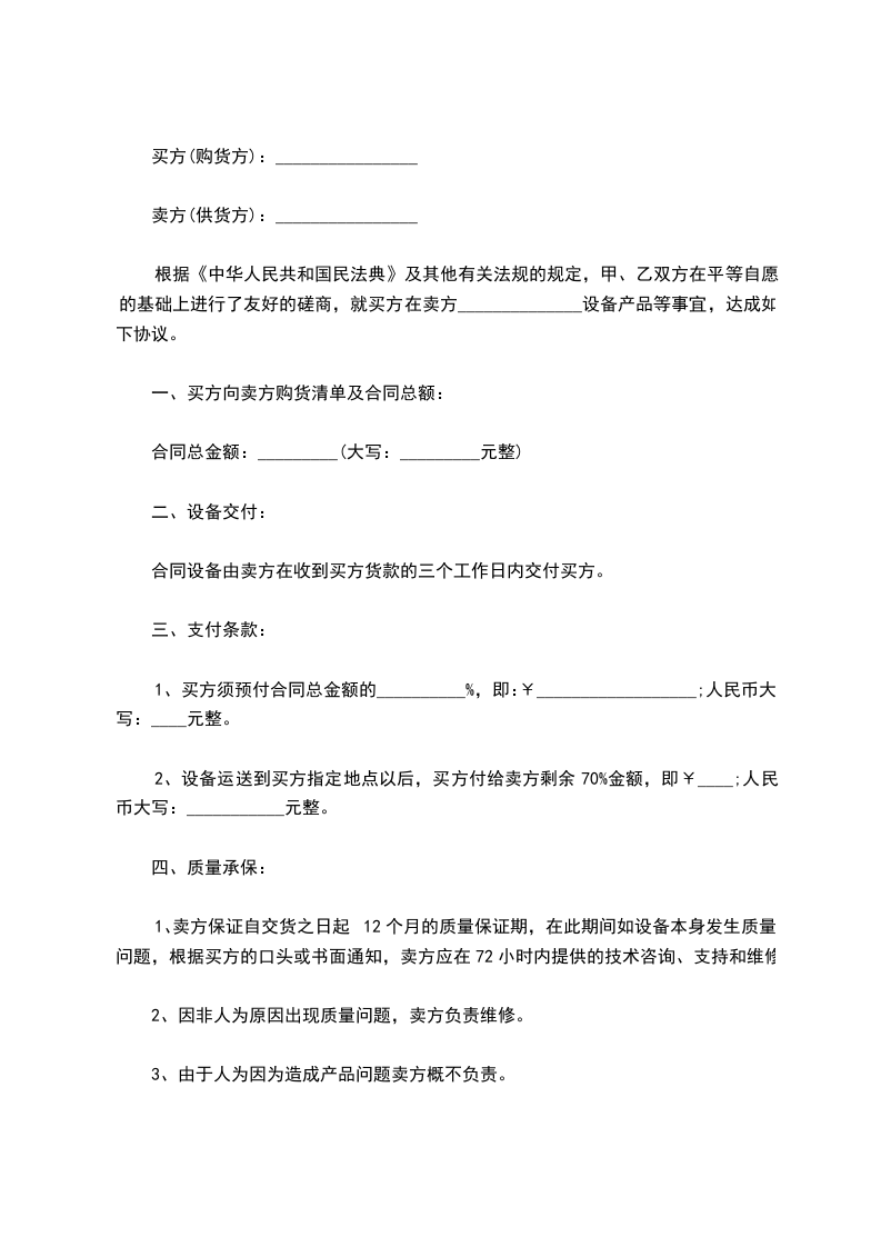 根据《中华人民共和国民法典》及其他有关法规的规定,甲、乙双方在平等自愿的基础上进行了友好的磋商,就买方在卖方______________设备产品等事宜,达成如下协议。
