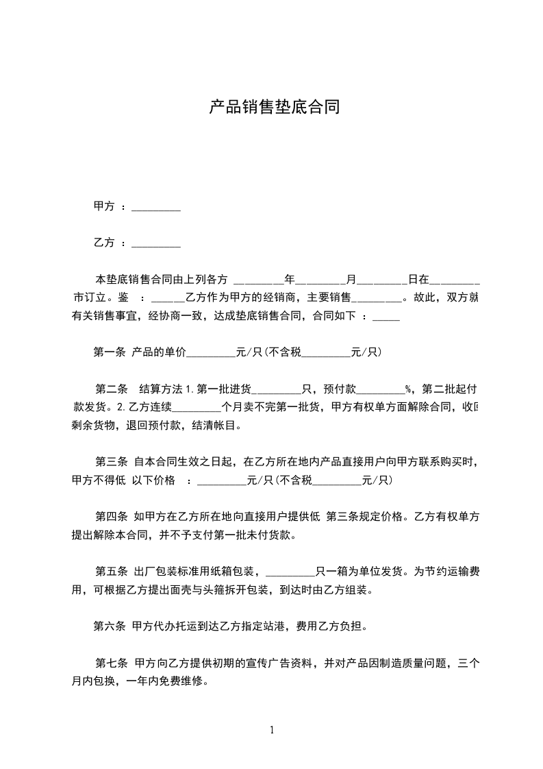 乙方作为甲方的经销商,主要销售_________。故此,双方就有关销售事宜,经协商一致,达成垫底销售合同,合同如下: