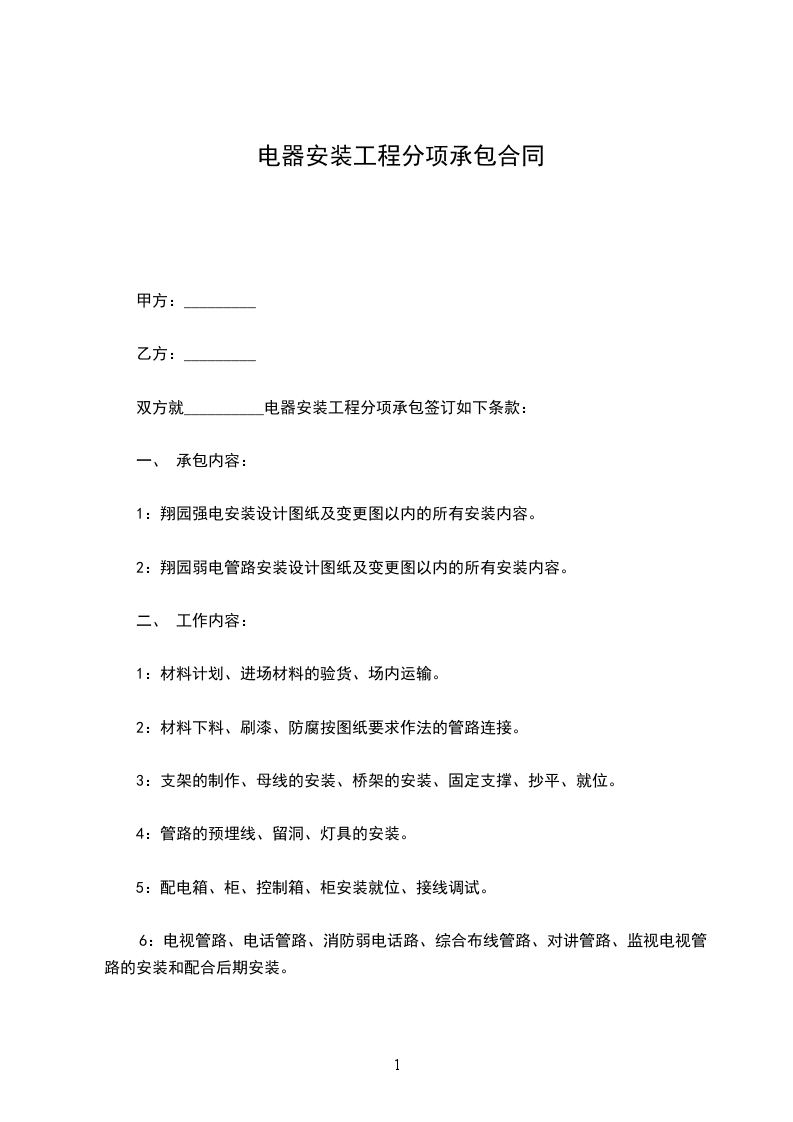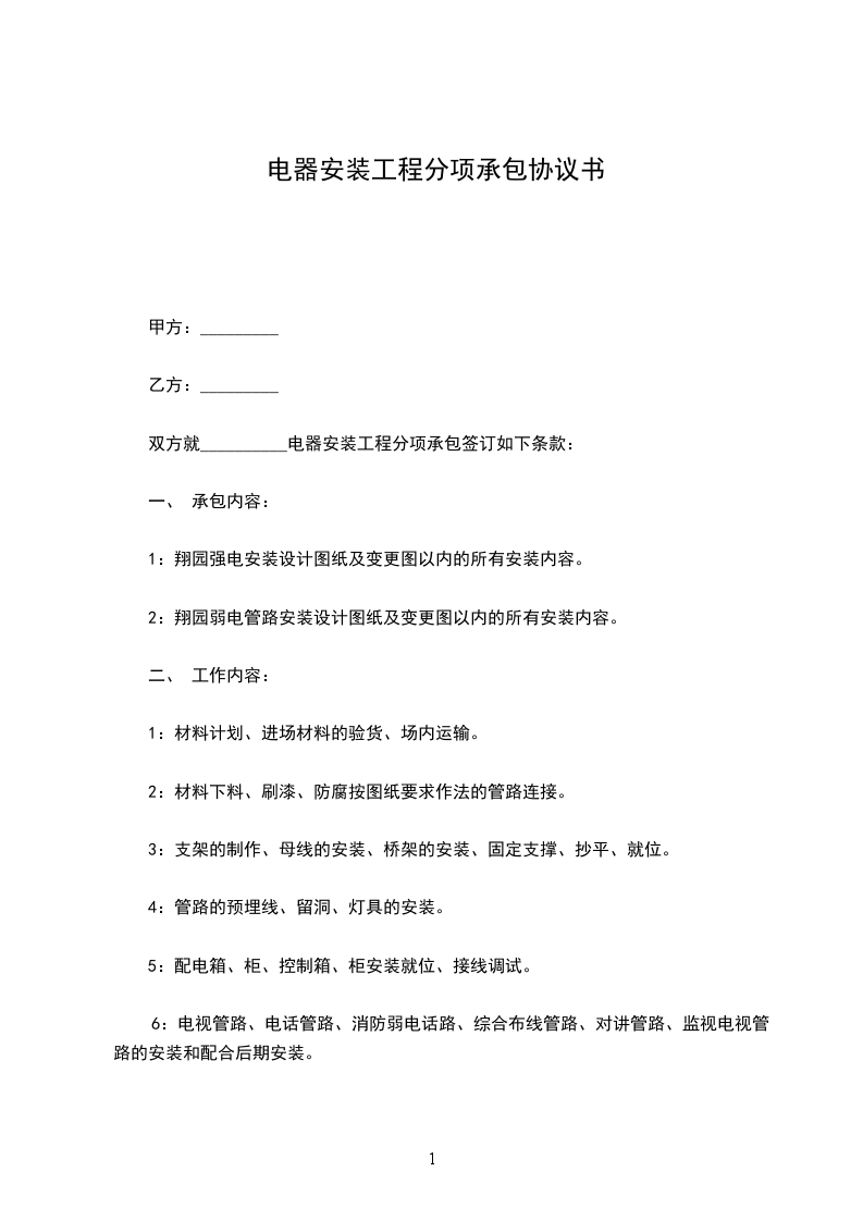 双方就__________电器安装工程分项承包签订如下条款: