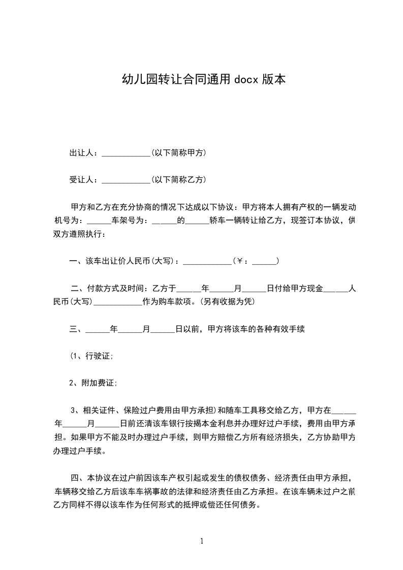 范本 转让方(甲方): 身份证号: 受让方(乙方): 身份证号: 甲、乙双方经友好协商,就幼儿园转让事宜达成以下协议: