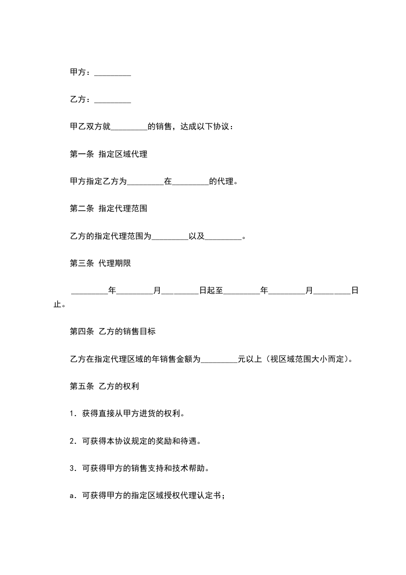 乙方在指定代理区域的年销售金额为_________元以上(视区域范围大小而定)。
