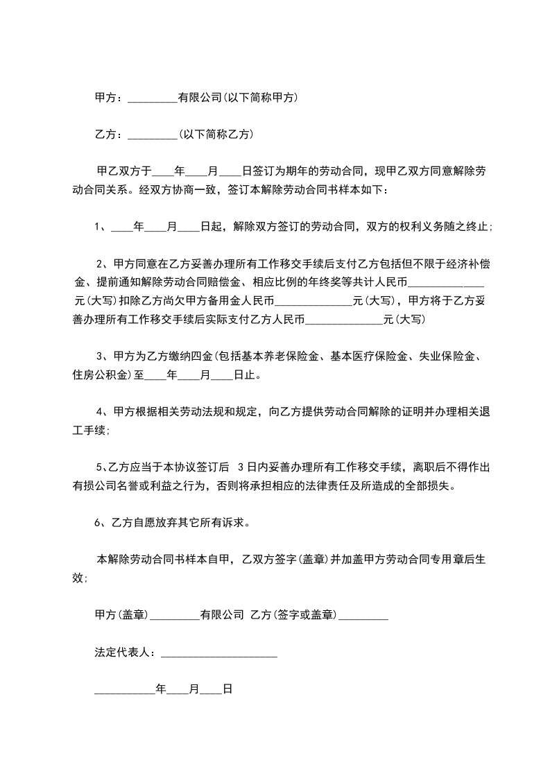1、____年____月____日起,解除双方签订的劳动合同,双方的权利义务随之终止;