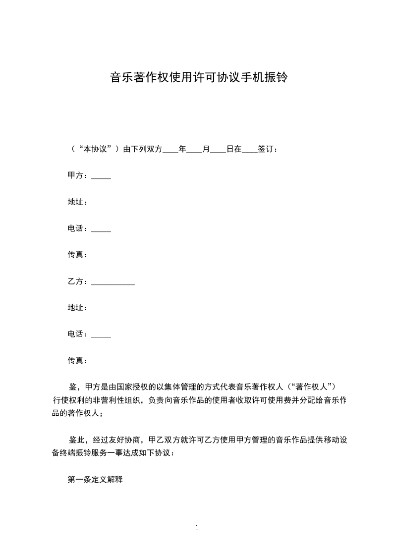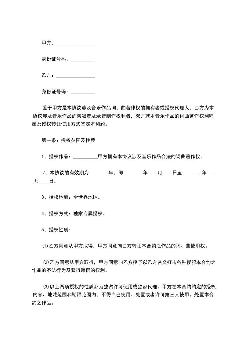 1、授权作品:__________甲方拥有本协议涉及音乐作品合法的词曲著作权。