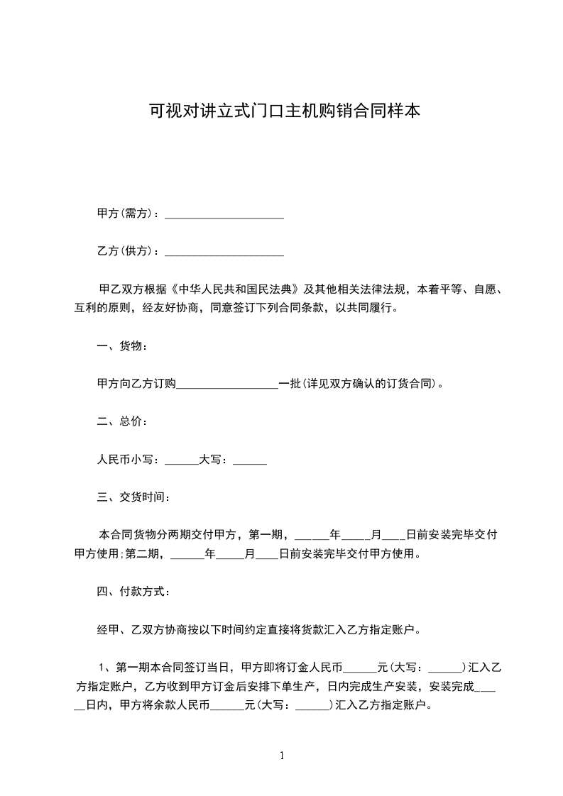 1、第一期本合同签订当日,甲方即将订金人民币______元(大写:______)汇入乙方指定账户,乙方收到甲方订金后安排下单生产,日内完成生产安装,安装完成______日内,甲方将余款人民币______元(大写:______)汇入乙方指定账户。