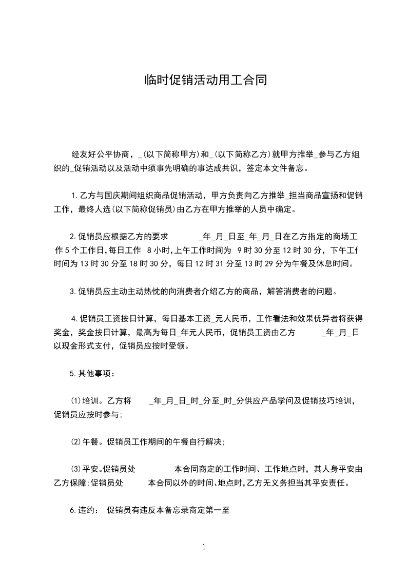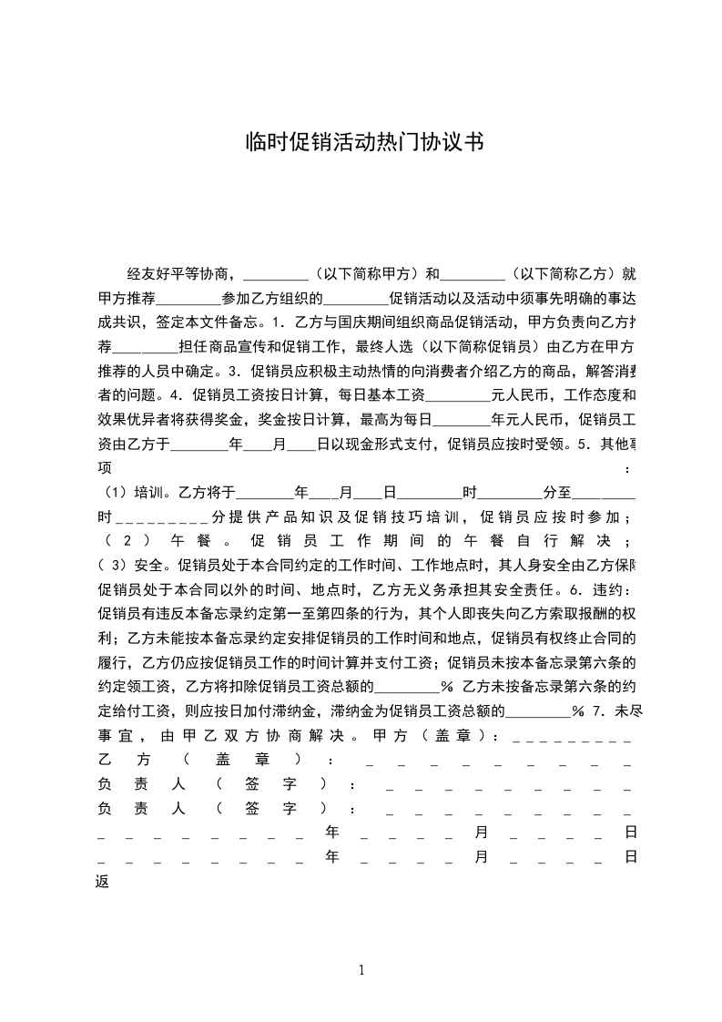 经友好平等协商,_________(以下简称甲方)和_________(以下简称乙方)就甲方推荐_________参加乙方组织的_________促销活动以及活动中须事先明确的事达成共识,签定本文件备忘。1.乙方与国庆期间组织商品促销活动,甲方负责向乙方推荐_________担任商品宣传和促销工作,最终人选(以下简称促销员)由乙方在甲方推荐的人员中确定。3.促销员应积极主动热情的向消费者介绍乙方的商品,解答消费者的问题。4.促销员工资按日计算,每日基本工资_________元人民币,工作态度和效果优异者将获得奖金,奖金按日计算,最高为每日________年元人民币,促销员工资由乙方于________年____月____日以现金形式支付,促销员应按时受领。5.其他事项: