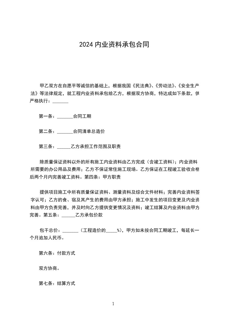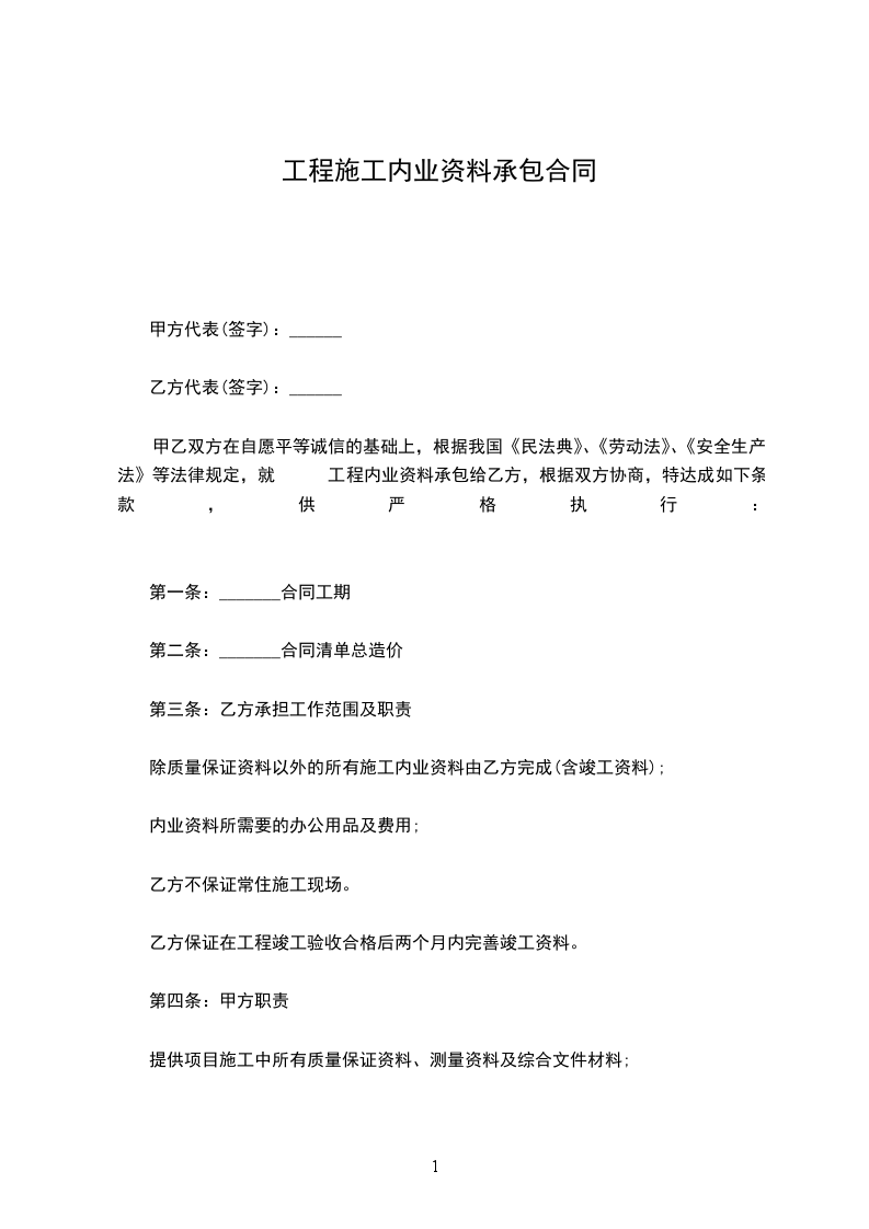 甲乙双方在自愿平等诚信的基础上,根据我国《民法典》、《劳动法》、《安全生产法》等法律规定,就工程内业资料承包给乙方,根据双方协商,特达成如下条款,供严格执行:_______