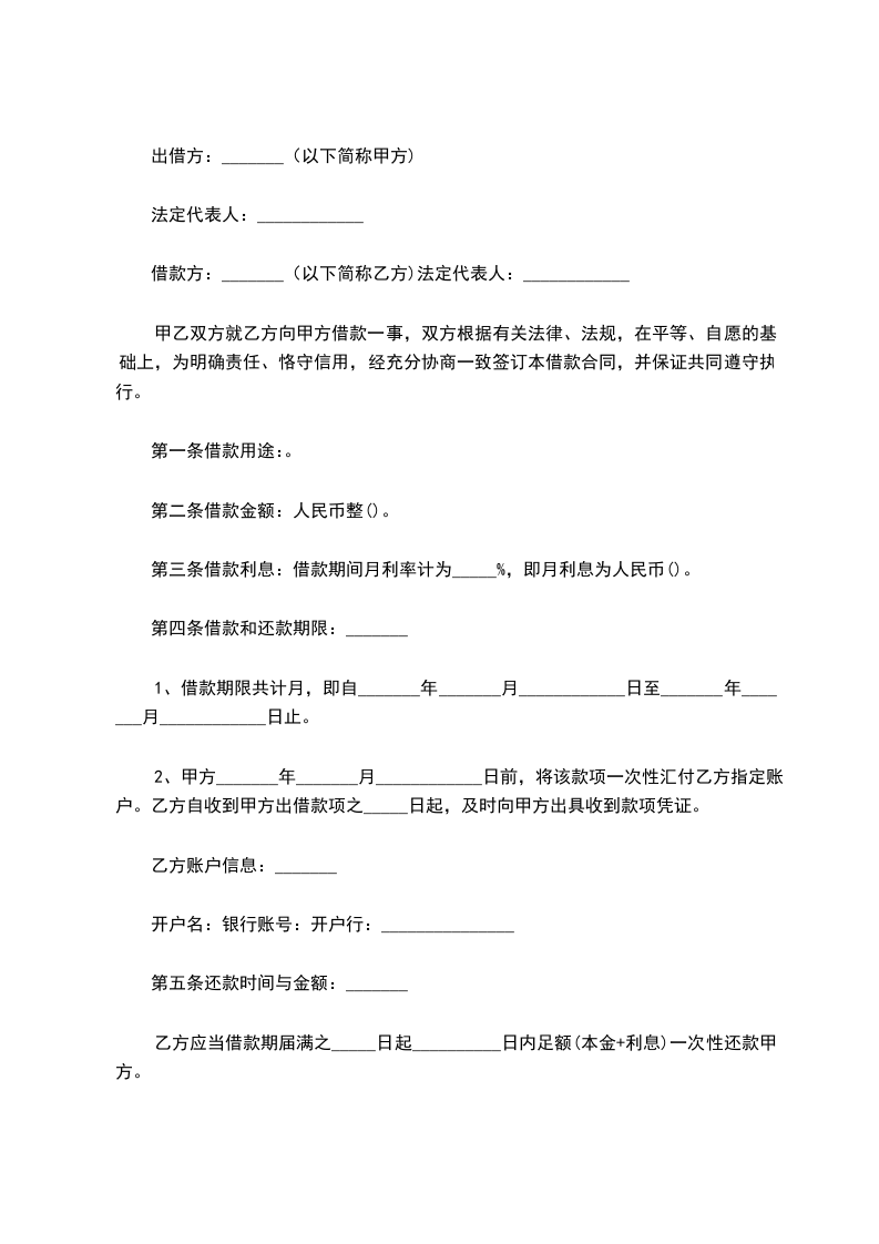 第一条:甲方(出借人)_________出借人民币_________,期限___个月,自______年___月___日至______年___月___日止。借款期限届满日为法定节假日、休息日的,顺延至节假日、休息日后的第一个工作日,利息按实际占有天数计算。