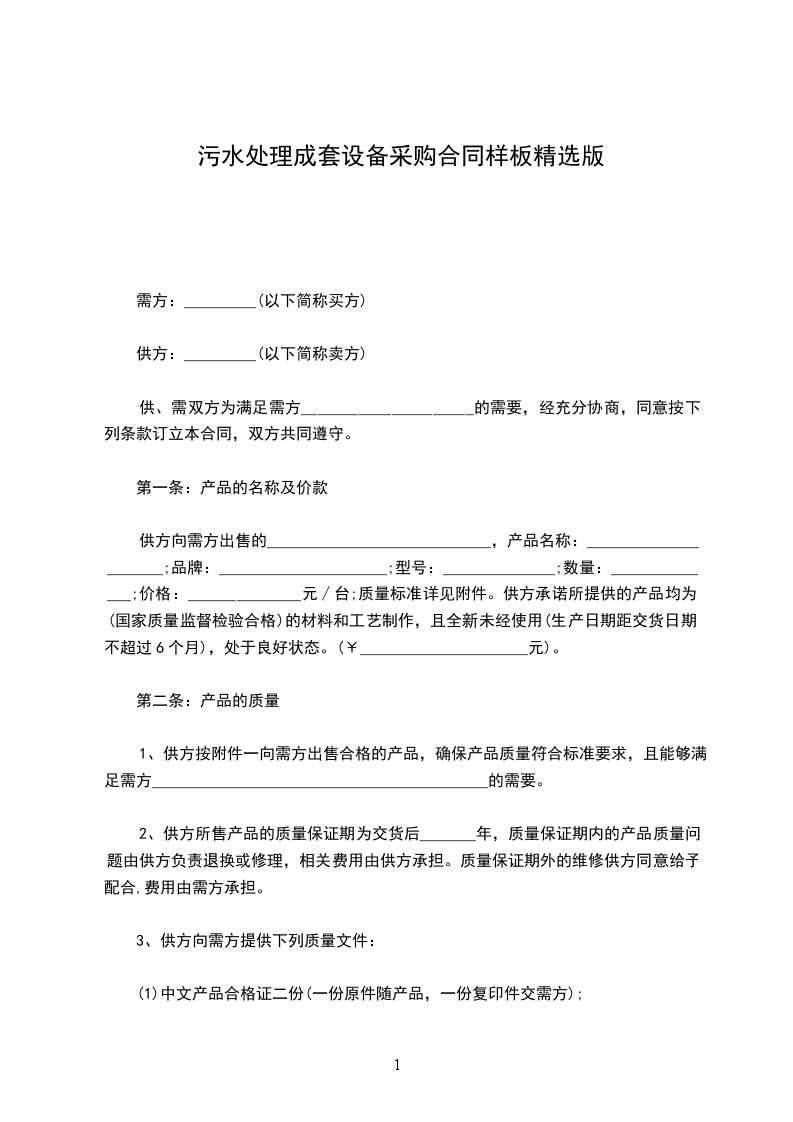 供方向需方出售的____________________________,产品名称:_____________________;品牌:_____________________;型号:______________;数量:______________;价格:______________元∕台;质量标准详见附件。供方承诺所提供的产品均为(国家质量监督检验合格)的材料和工艺制作,且全新未经使用(生产日期距交货日期不超过6个月),处于良好状态。(¥_____________________元)。