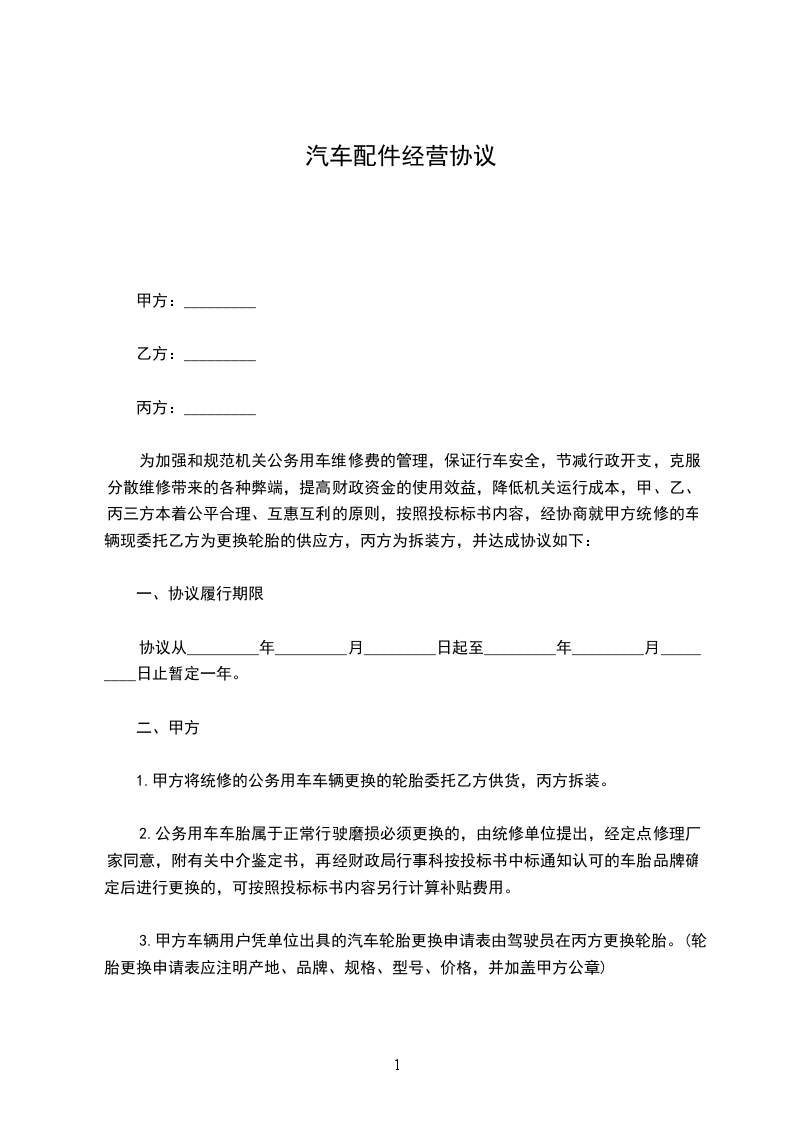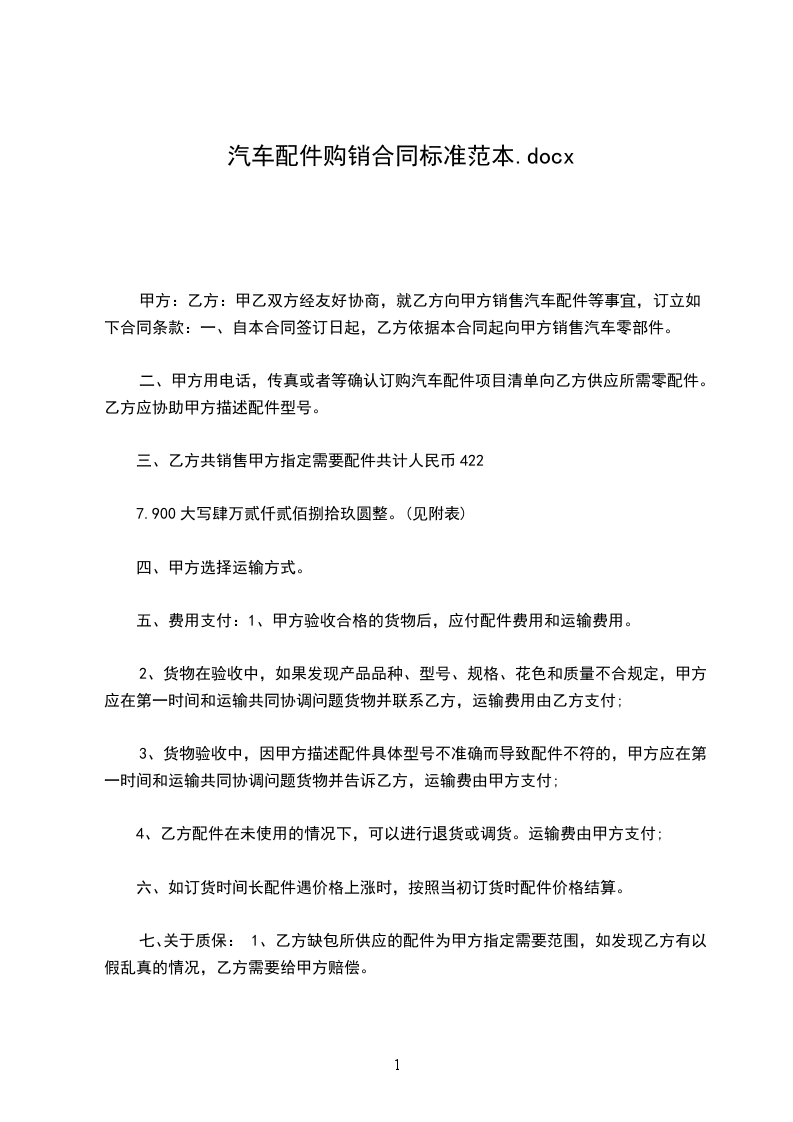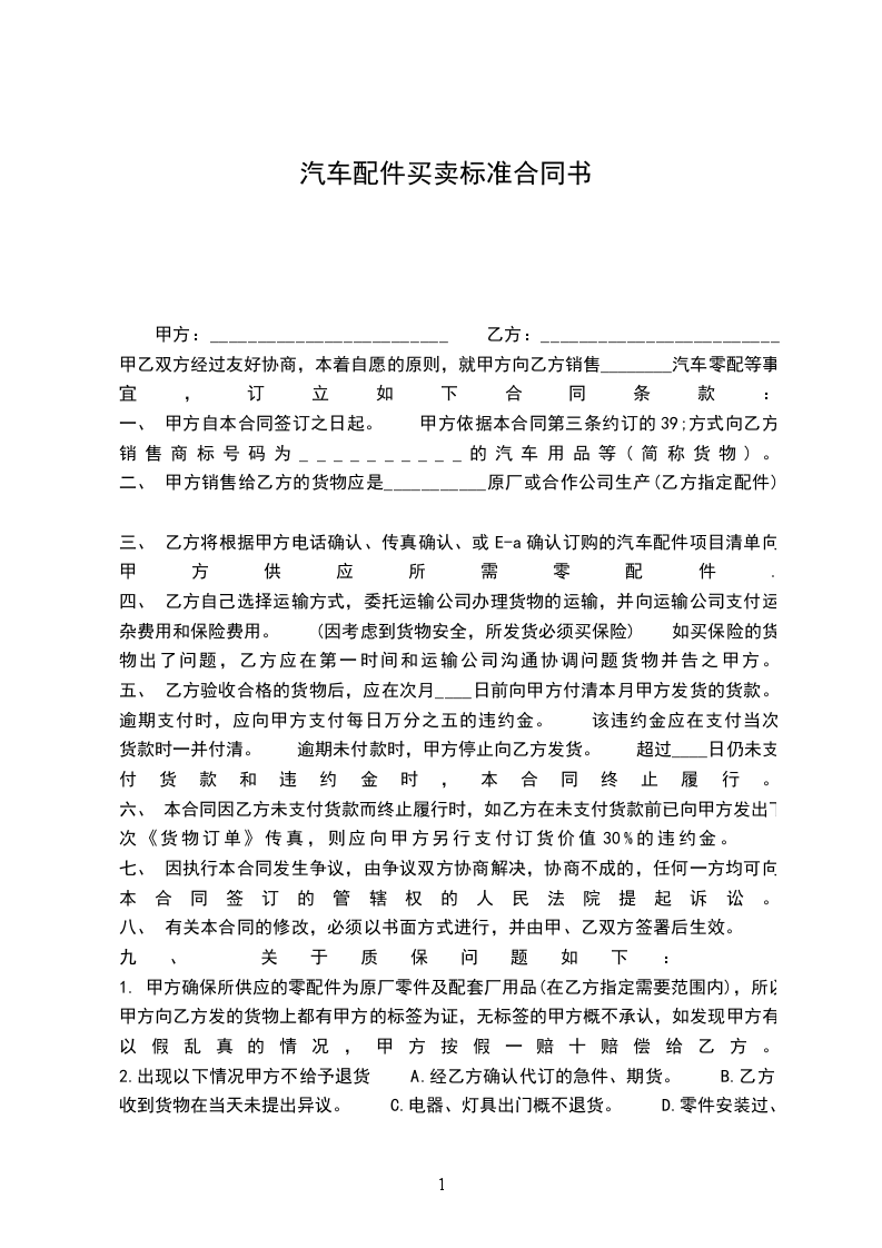 甲乙双方经过友好协商,本着自愿的原则,就甲方向乙方销售________汽车零配等事宜,订立如下合同条款: