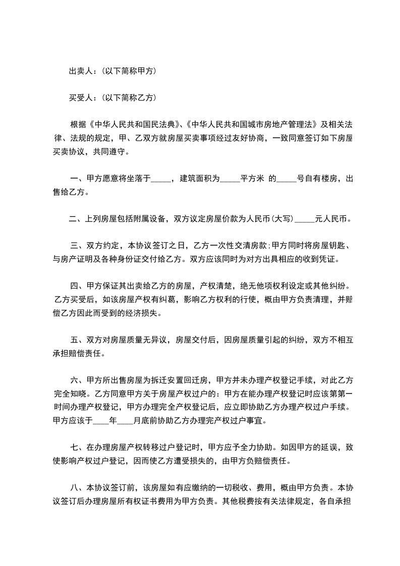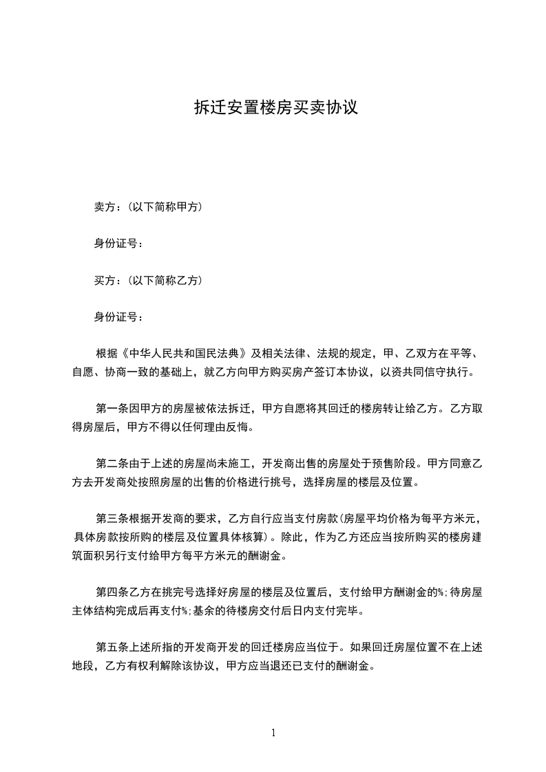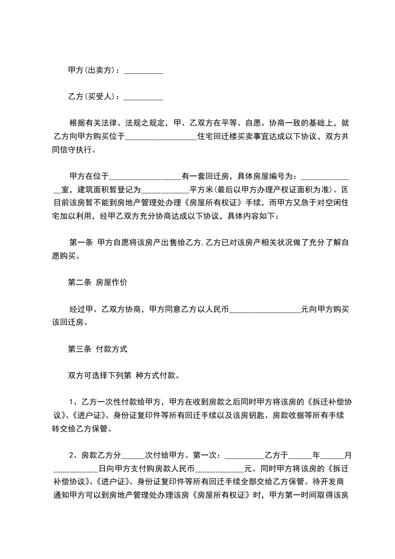 第一条、因甲方的房屋被依法拆迁,甲方自愿将其回迁安置的位或位的房屋转让给乙方,面积约平方,房价每平方元。