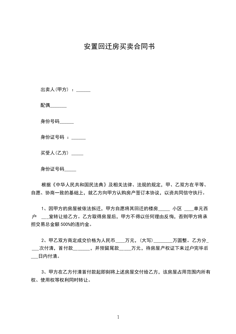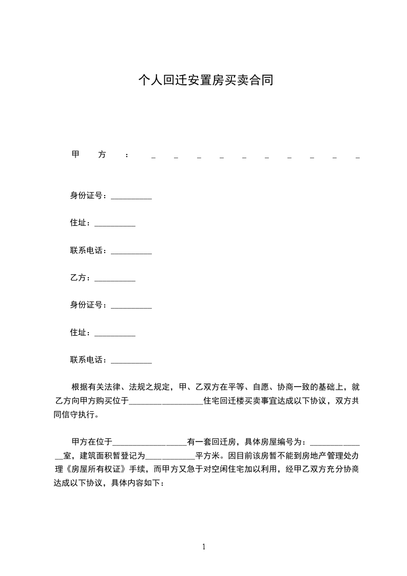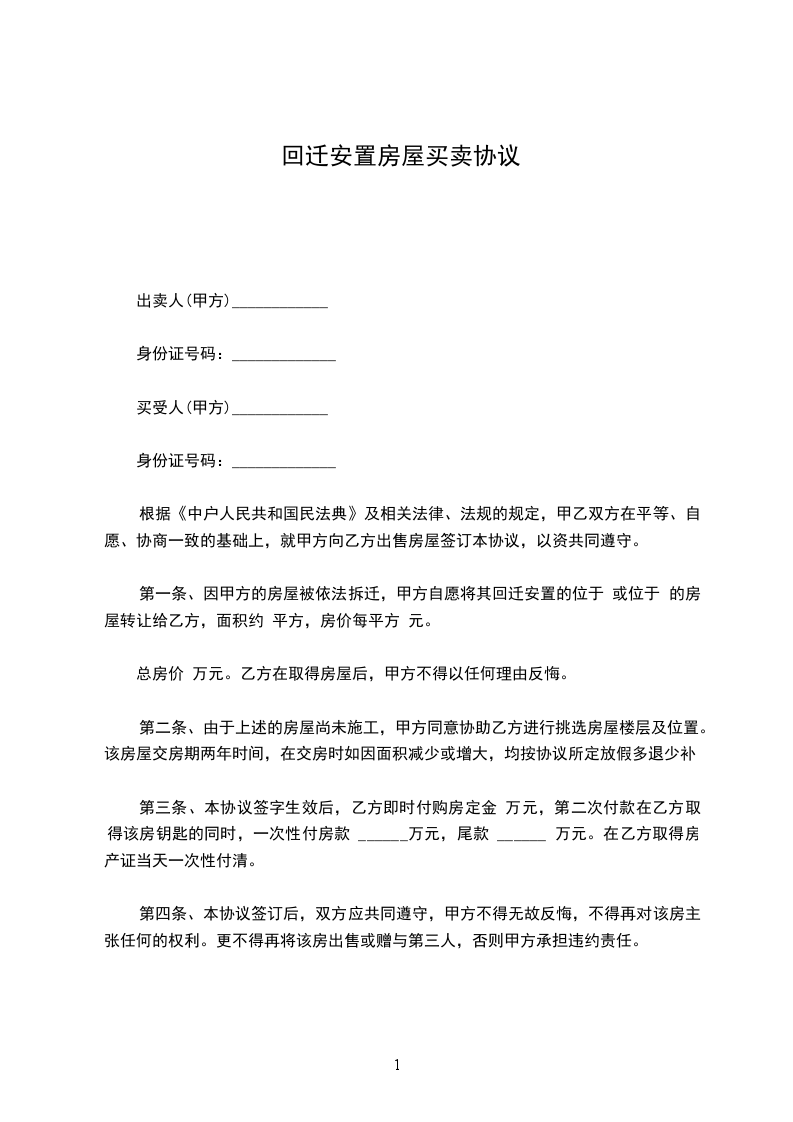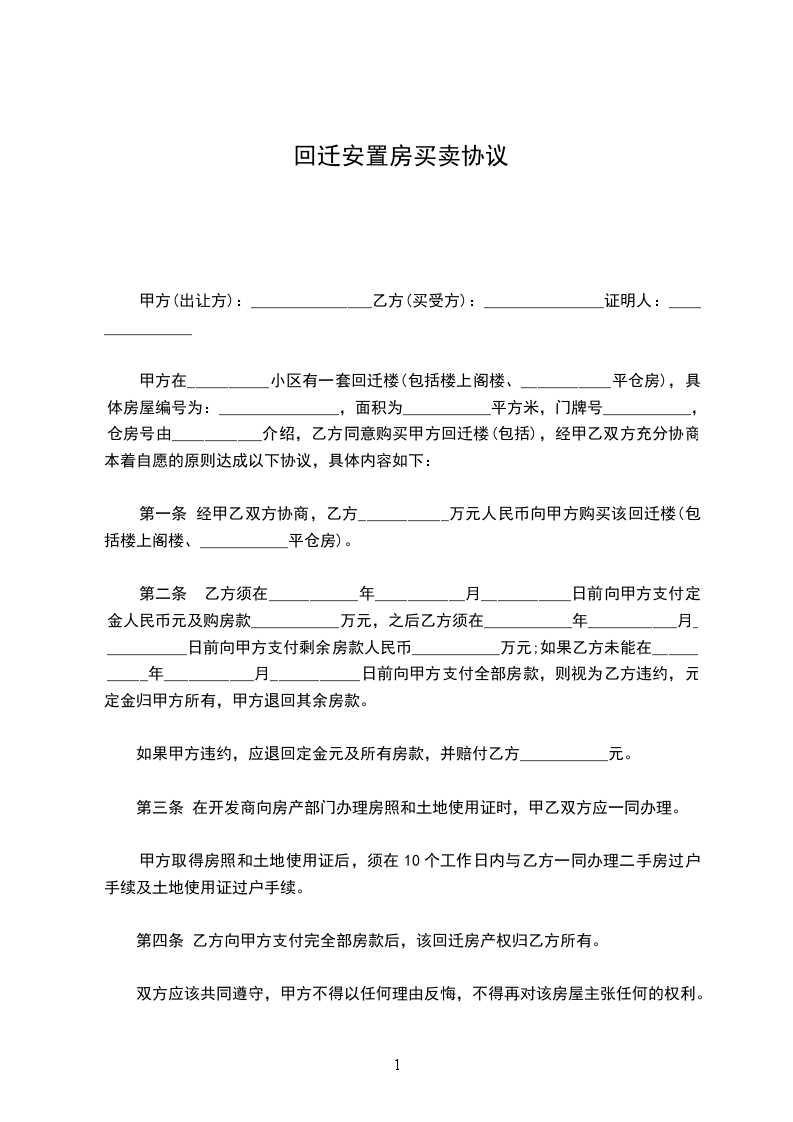 第一条、因甲方的房屋被依法拆迁,甲方自愿将其回迁安置的位或位的房屋转让给乙方,面积约平方,房价每平方元。