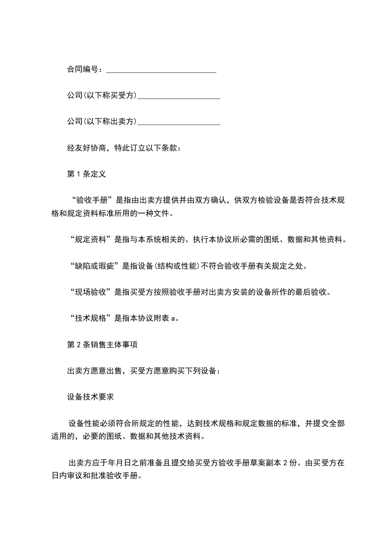 出卖方应在年月日前完成设备的安装和调试工作;并完成验收手册所规定的各项检测;同时,出卖方须在设备验收单证上签字,证明业已完成检测。验收单证上应注明双方认可的,且应由出卖方在双方议定的期间内校正的仍可能存在的缺陷。