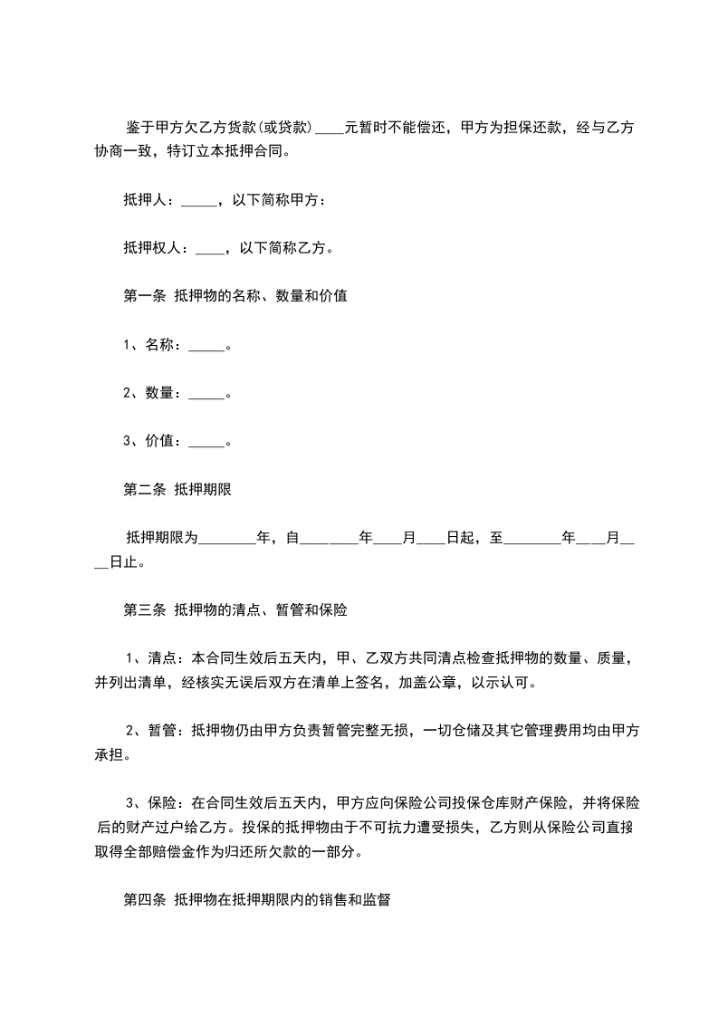 3、保险:在合同生效后五天内,甲方应向保险公司投保仓库财产保险,并将保险后的财产过户给乙方。投保的抵押物由于不可抗力遭受损失,乙方则从保险公司直接取得全部赔偿金作为归还所欠款的一部分。
