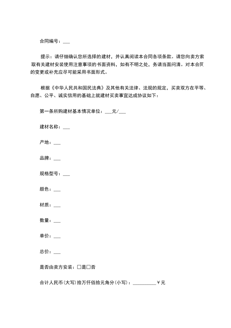 根据《中华人民共和国民法典》及其他有关法律、法规的规定,买卖双方在平等、自愿、公平、诚实信用的基础上就建材买卖事宜达成协议如下: