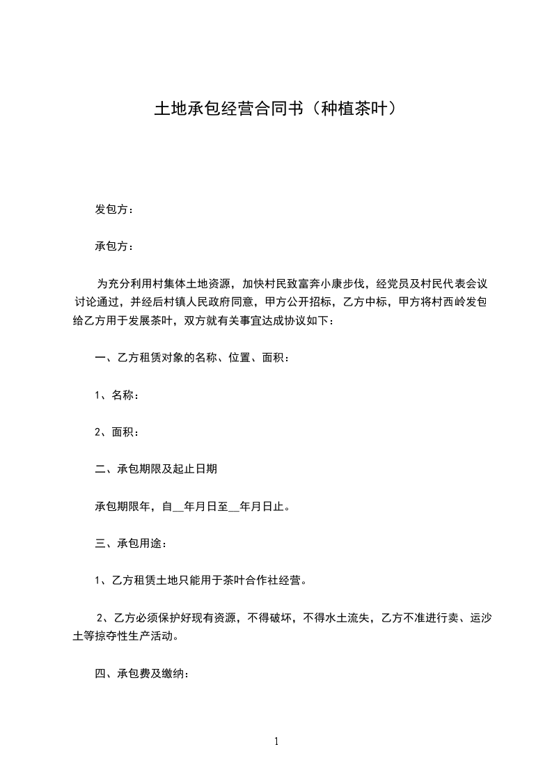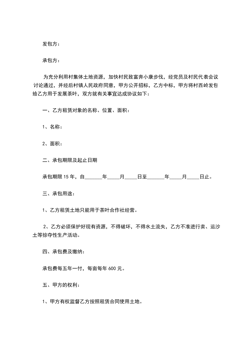 为充分利用村集体土地资源,加快村民致富奔小康步伐,经党员及村民代表会议讨论通过,并经后村镇人民政府同意,甲方公开招标,乙方中标,甲方将村西岭发包给乙方用于发展茶叶,双方就有关事宜达成协议如下: