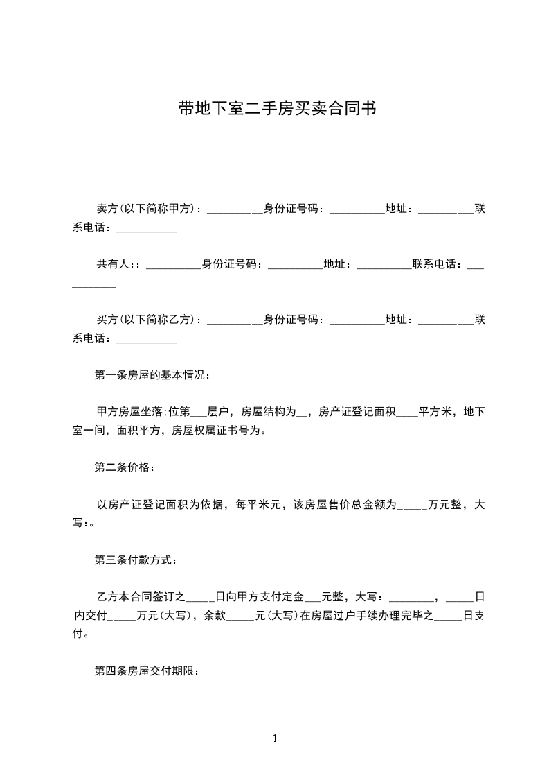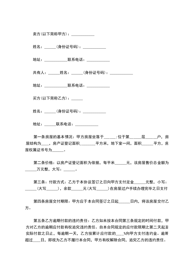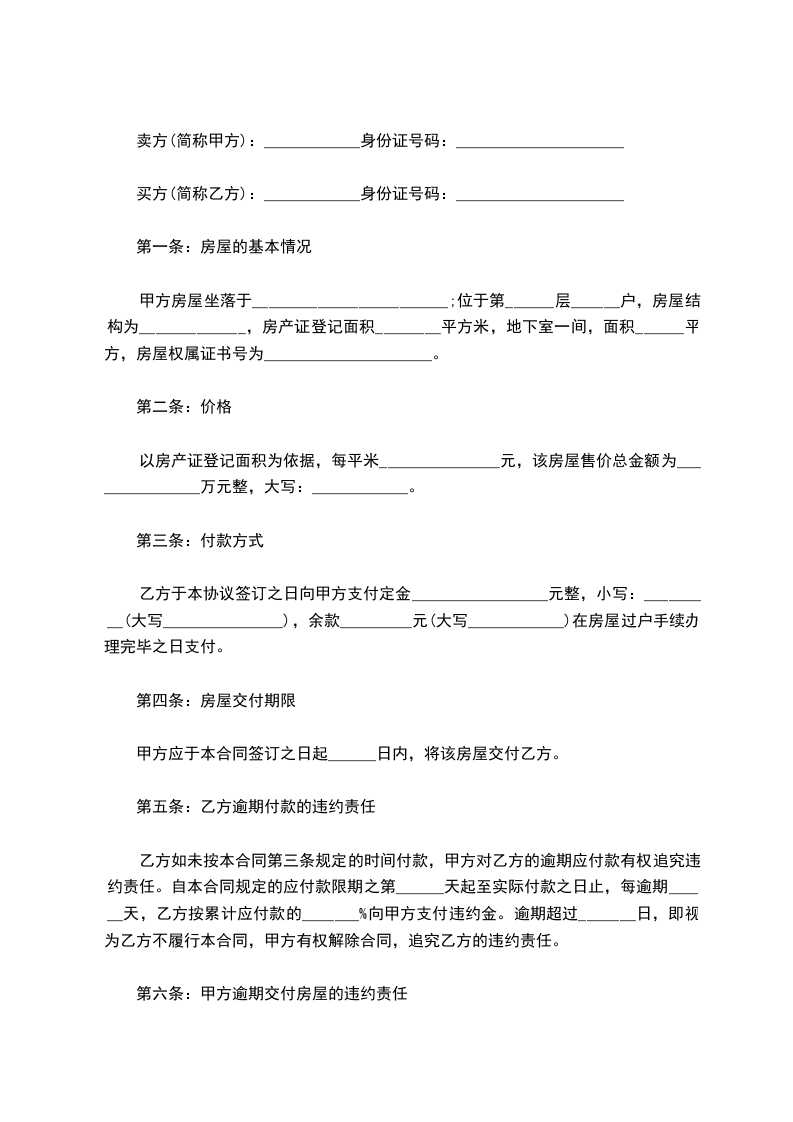 甲方房屋坐落;位第___层户,房屋结构为__,房产证登记面积____平方米,地下室一间,面积平方,房屋权属证书号为.