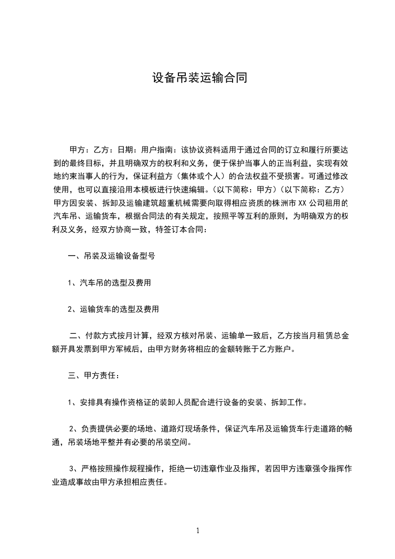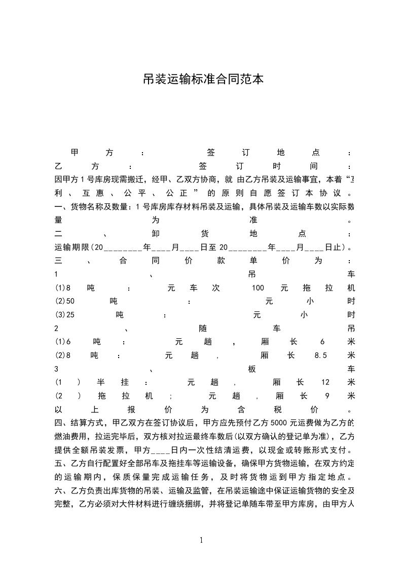 因甲方1号库房现需搬迁,经甲、乙双方协商,就 由乙方吊装及运输事宜,本着“互利、互惠、公平、公正”的原则自愿签订本协议。