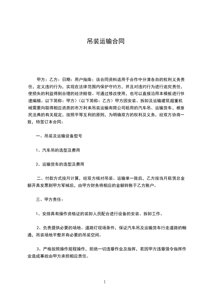 七、乙方负责吊装运输货物的安全工作,严格按安全标准组织吊装,并随时接受甲方负责人员监督,乙方在在吊装和运输过程中因违规操作出现的任何安全事故由乙方自行负责,甲方不承担任何责任。甲方不得扣押乙方吊车及附属设施、不得以任何理由滞留乙方吊车及附属设施。