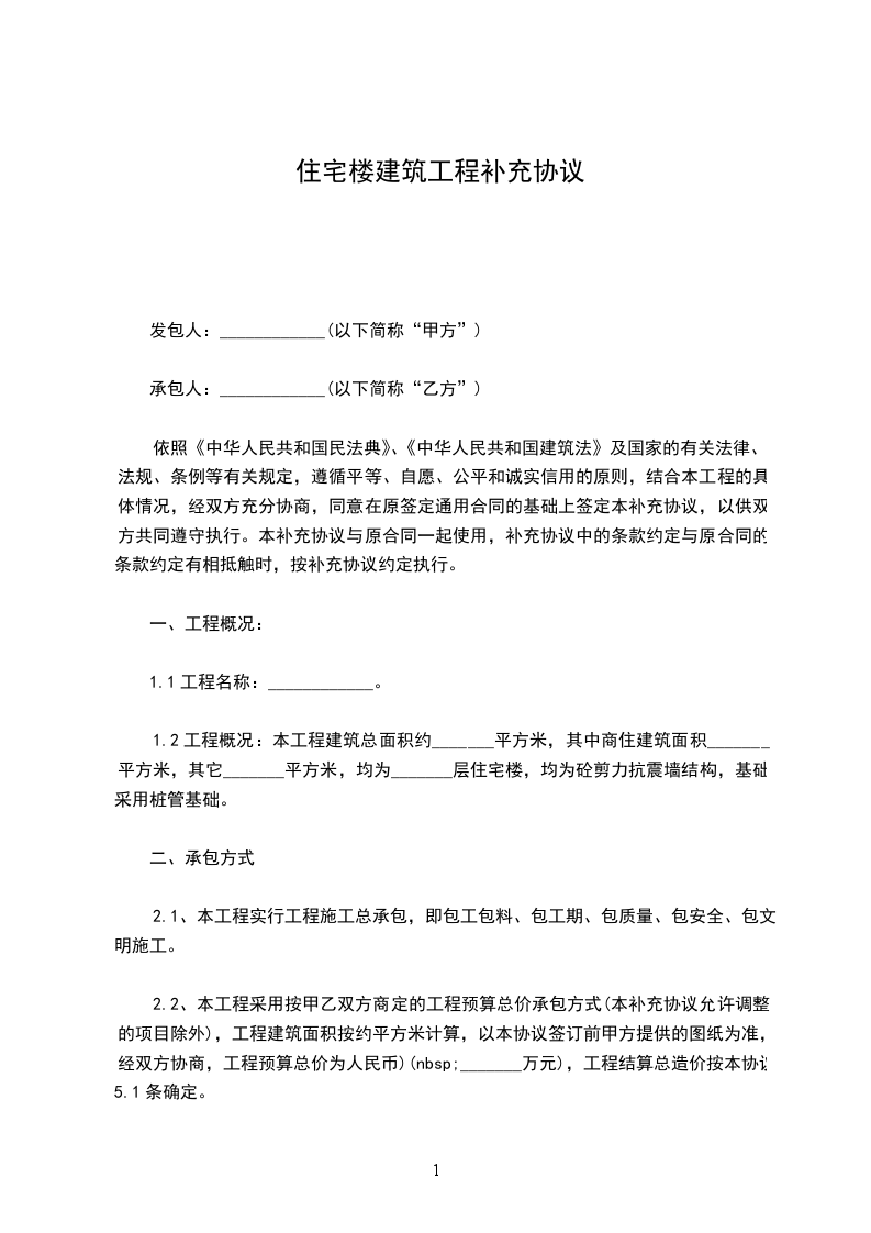 建筑工程补充合同范文1