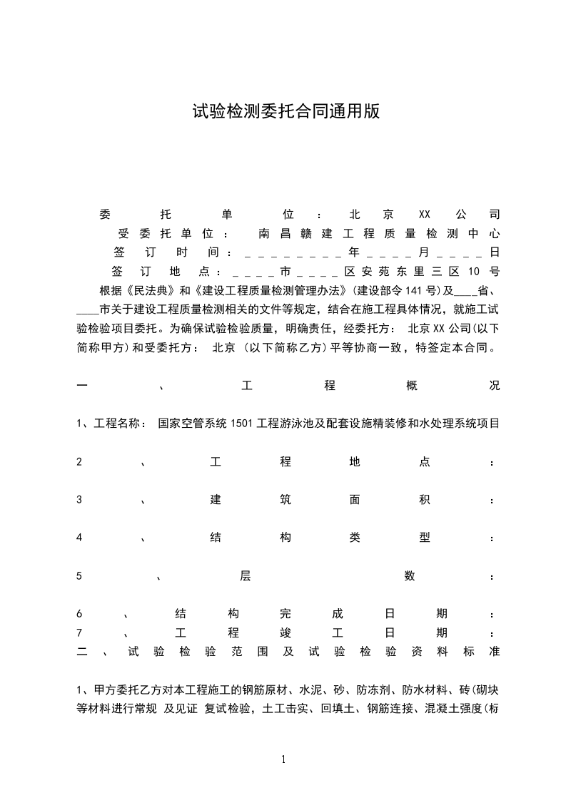 根据《民法典》和《建设工程质量检测管理办法》(建设部令141号)及____省、____市关于建设工程质量检测相关的文件等规定,结合在施工程具体情况,就施工试验检验项目委托。为确保试验检验质量,明确责任,经委托方: 北京XX公司(以下简称甲方)和受委托方: 北京 (以下简称乙方)平等协商一致,特签定本合同。