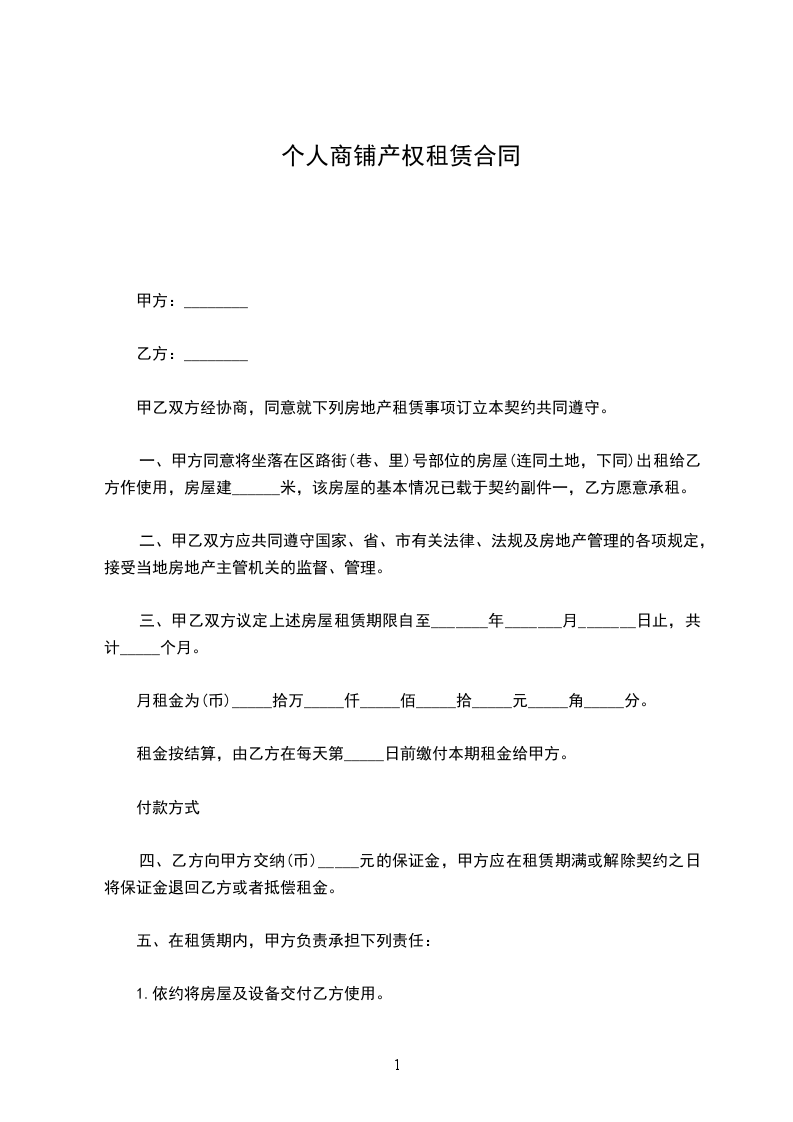 四、乙方向甲方交纳(币)_____元的保证金,甲方应在租赁期满或解除契约之日将保证金退回乙方或者抵偿租金。