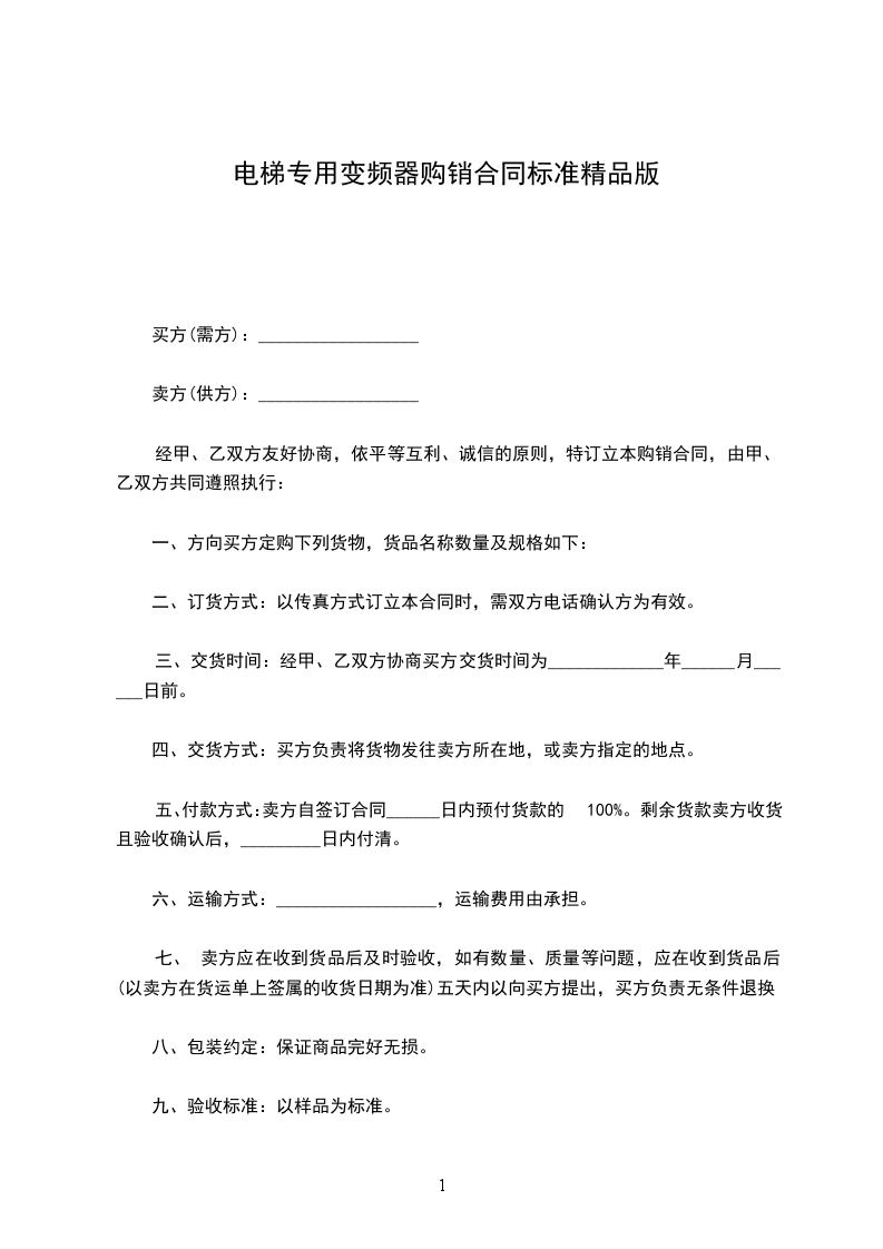 五、付款方式:卖方自签订合同______日内预付货款的100%。剩余货款卖方收货且验收确认后,_________日内付清。