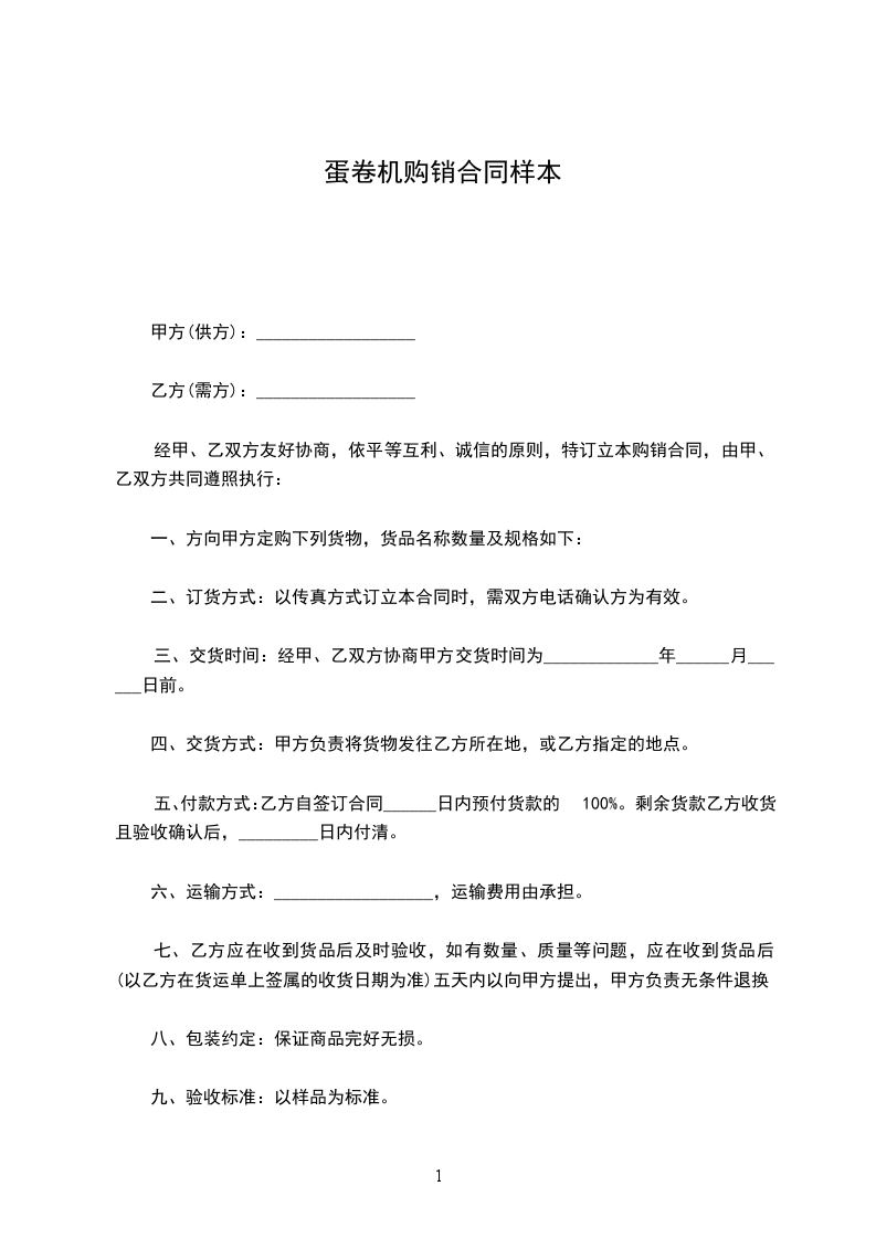 五、付款方式:乙方自签订合同______日内预付货款的100%。剩余货款乙方收货且验收确认后,_________日内付清。