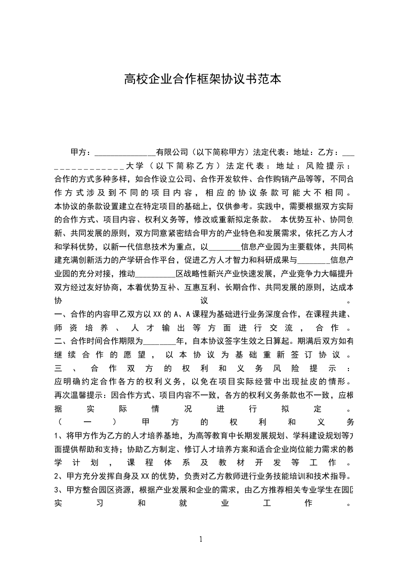甲方:_______________有限公司(以下简称甲方)法定代表:地址:乙方:_______________大学(以下简称乙方)法定代表:地址:风险提示: